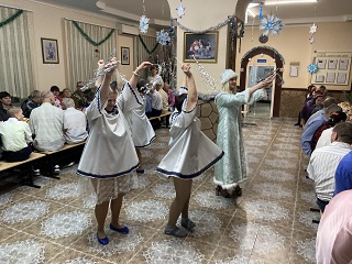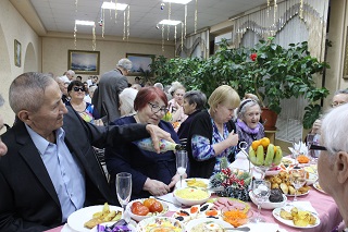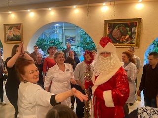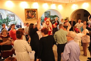 Праздничный ужин прошел в теплой семейной обстановке, под звон фужеров проживающие смогли поздравить друг друга, пообщаться и отдохнуть в непринужденной атмосфере. Некоторые приготовили новогодние номера и продемонстрировали свои таланты. Юная Анна Василькова исполнила несколько новогодних песен, а супружеская пара Михайловых – трогательный вальс. Конечно же, самыми долгожданными гостями стали Дед Мороз и Снегурочка. Они закружили всех в веселом праздничном хороводе.