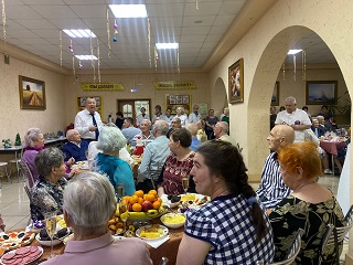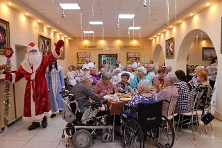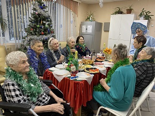 Проживающие 1,2 и 4 корпусов встретились в большой уютной столовой главного корпуса, где были накрыты новогодними угощениями праздничные столы. Всех приветствовал директор учреждения Сергей Владимирович Сафошкин, который поздравил проживающих с наступающим новым годом, пожелал крепкого здоровья, активного долголетия, мира и благополучия.