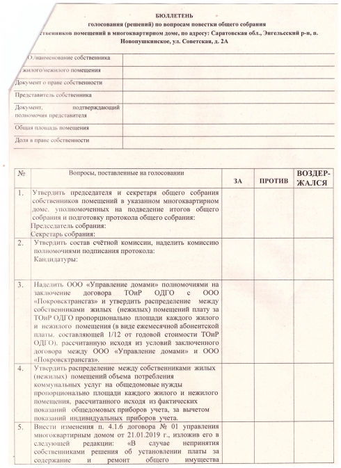 В нарушении статей жиллищного кодекса: никакого собрания не проводилось, кем обозначена повестка непонятно, сроки этого мероприятия незвестны, кто инициатор неизвестно.