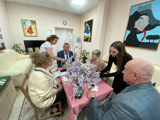 Гостей встречал директор дома-интерната Сергей Владимирович Сафошкин, который пригласил гостей совершить экскурсию по территории и корпусам учреждения. В новом жилом корпусе гости посетили Галину Егоровну Акимову, ветерана, которая длительное время вела большую общественную деятельность на благо района: двадцать лет работала помощником депутатов разных собраний, возглавляла региональное отделение партии «Российская партия пенсионеров за социальную справедливость». За приятным чаепитием Галина Егоровна рассказала о жизни в учреждении и поинтересовалась планами развития города. Гости подарили ветерану памятный подарок.