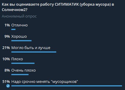 На вопрос «Как вы оцениваете работу СИТИМАТИК (уборка мусора) в Солнечном 2» 51 % опрошенных требуют срочно сменить оператора, 10% - процентов оценивают работу «плохо», 8% - «очень плохо». 21% опрошенных считают, что «могло бы быть и лучше», 9% - поставили оценку «хорошо», 1 % - «отлично». По сумме получается, что почти 70% граждан выразили свое негативное отношение к работе компании и только 10% выразили полную удовлетворенность качеством вывоза мусора.
