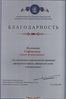 За укрепление патриотизма среди членов коллектива и проживающих, чуткое и внимательное отношение к ветеранам и участникам военных действий директору учреждения Сергею Сафошкину объявлена Благодарность национальной ассоциации объединений офицеров запаса Вооруженных Сил «За соблюдение и приумножение традиций офицерского корпуса, офицерской чести и достоинства».