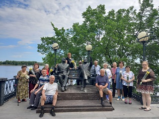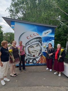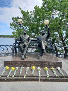 Затем экскурсанты-краеведы возложили цветы к памятнику Ю.А. Гагарину и С.П. Королеву «Перед полетом...», расположенному на живописной городской набережной.