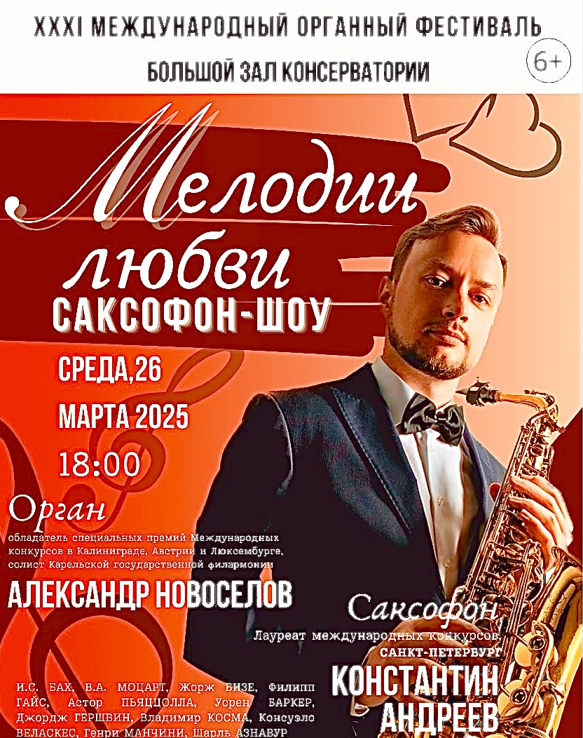 26 марта с программой «САКСОФОН-ШОУ. МЕЛОДИИ ЛЮБВИ» выступит лауреат международных конкурсов, солист Заслуженного коллектива России академического симфонического оркестра Санкт-Петербургской филармонии КОНСТАНТИН АНДРЕЕВ (саксофон). Он обучался у профессоров Италии, Франции, Бельгии и Швейцарии. Прозвучат трогательные и романтичные мелодии Ш. Азнавура, Ж.Косма, П.Иттюральде, А.Пьяццоллы и Г.Манчини.