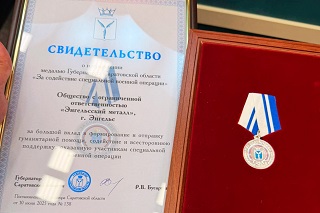 Медалью Губернатора Саратовской области Романа Викторовича Бусаргина «За содействие специальной военной операции» награждено Общество с ограниченной ответственностью «Энгельсский металл». За большой вклад в формирование и отправку гуманитарной помощи, содействие и всестороннюю поддержку, оказанную участникам специальной военной операции.