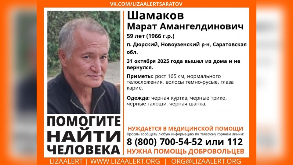 В Новоузенском районе Саратовской области ищут без вести пропавшего 59-летнего Марата Шамакова. Об этом сообщает поисковый отряд "Лиза Алерт Саратов".