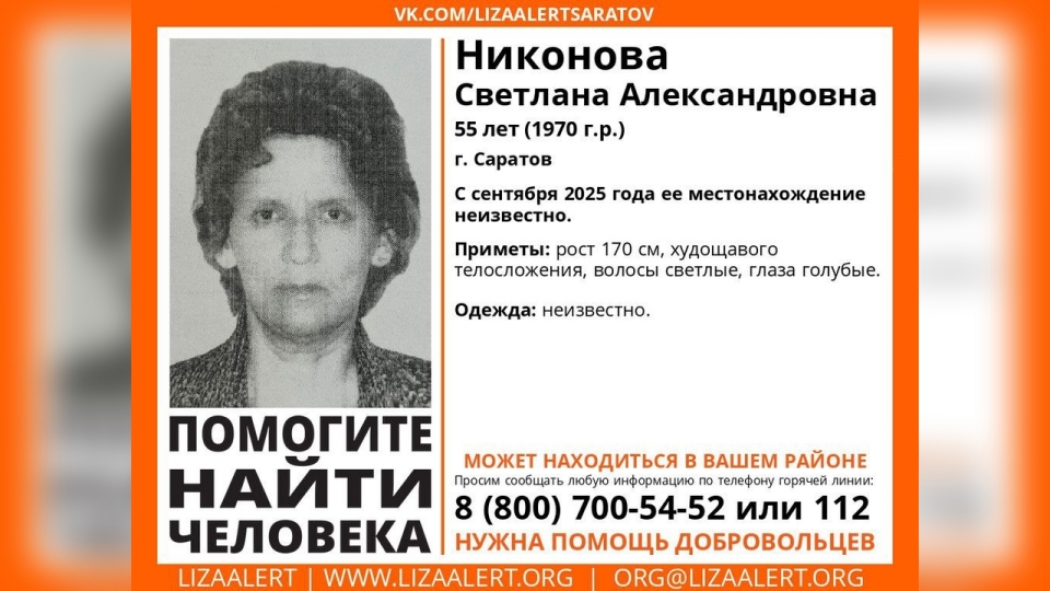 В Саратове ищут без вести пропавшую 55-летнюю Светлану Никонову, сообщает волонтерский отряд "Лиза Алерт Саратов".