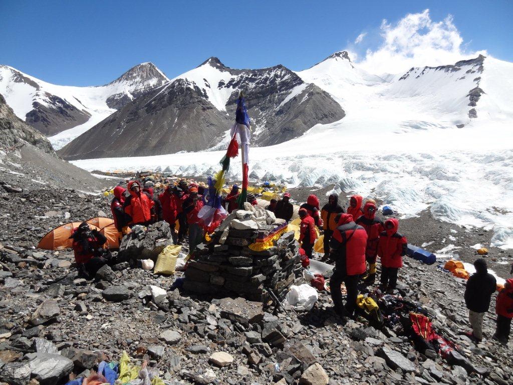 Даже на 6400м обязательна Пуджа И молитвы с развевающихся флажков доносятся до Будды