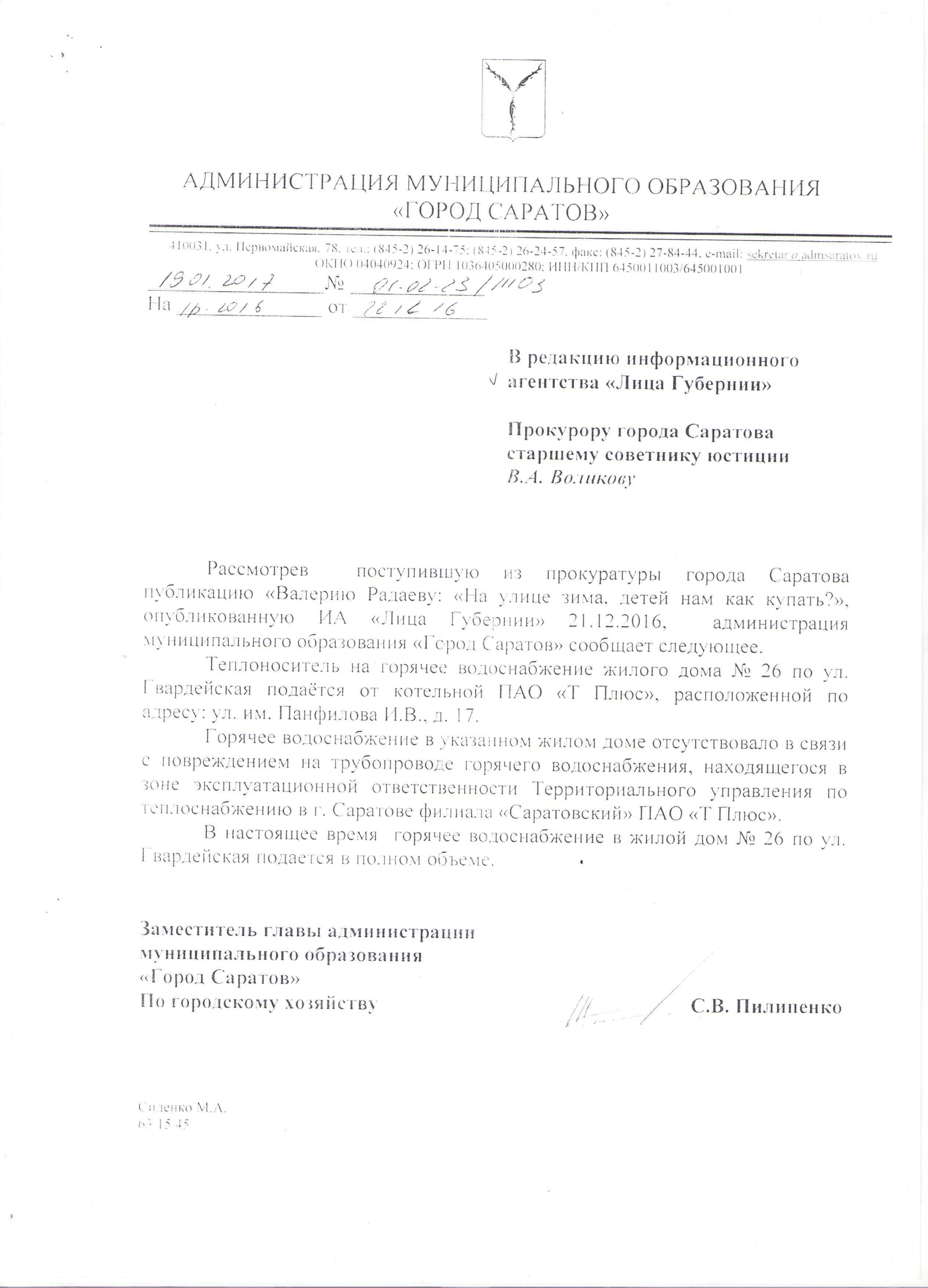 Уважаемый Валерий Васильевич! Сегодня по телеканалу "Россия 1" в новостях господин Чепрасов И.В. отчитался Вам, что авария с отоплением в г. Балаково ликвидирована. Это НЕ правда. Не всем домам города восстановили отопление. Например, в доме 8 по проезду Строителей. 3 дня назад подали заявку в ЖЭК – результатов никаких.