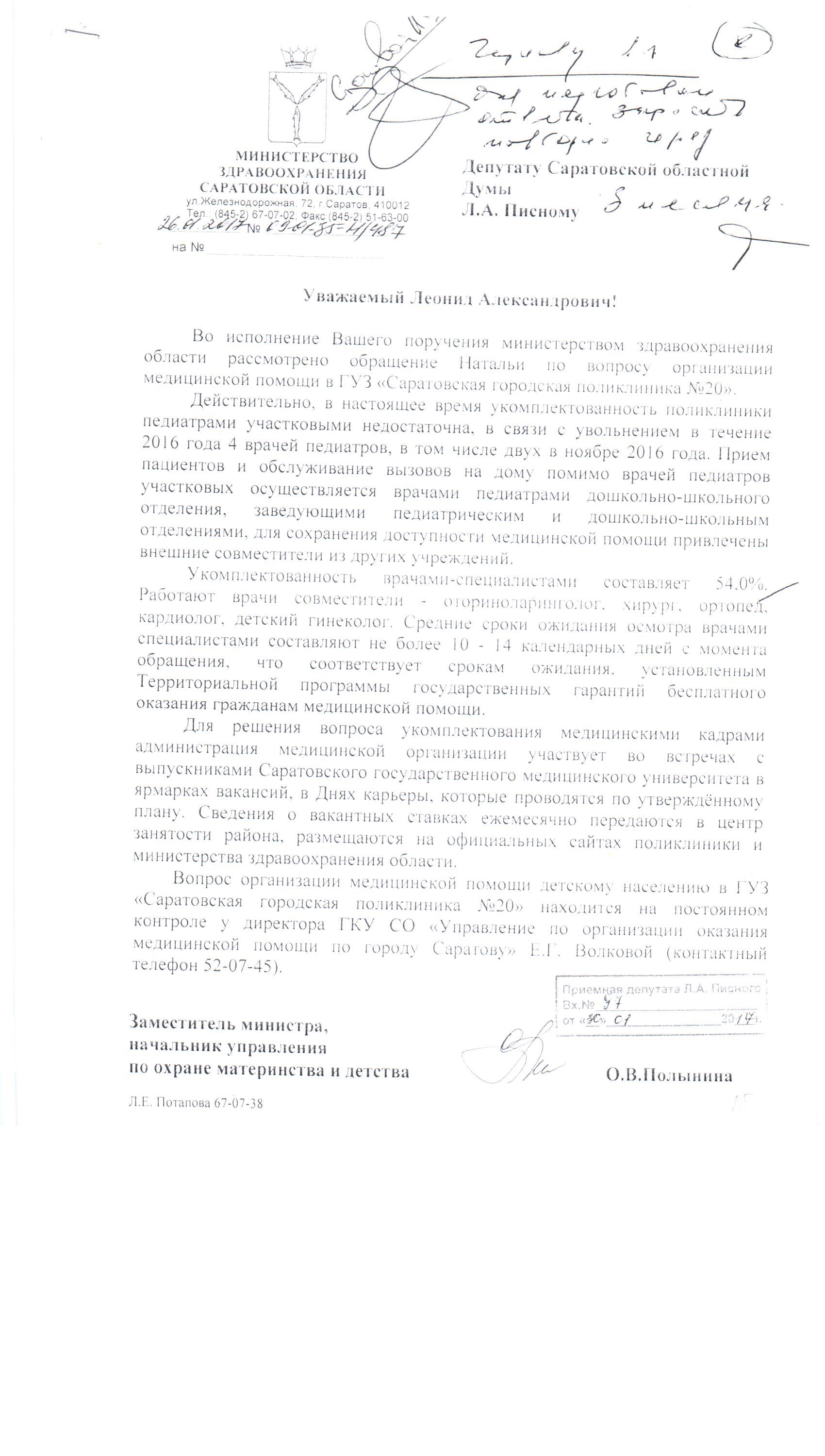 Добрый день , Леонид Александрович! Пишу к Вам с огромной проблемой, которая сложилась в поселке Юбилейном. В детской поликлинике № 20 на данный момент работает 1 педиатр!!!!! Остальные все уволились, не выдержав нагрузки. Район закрепленный за поликлиникой очень большой и "молодой".