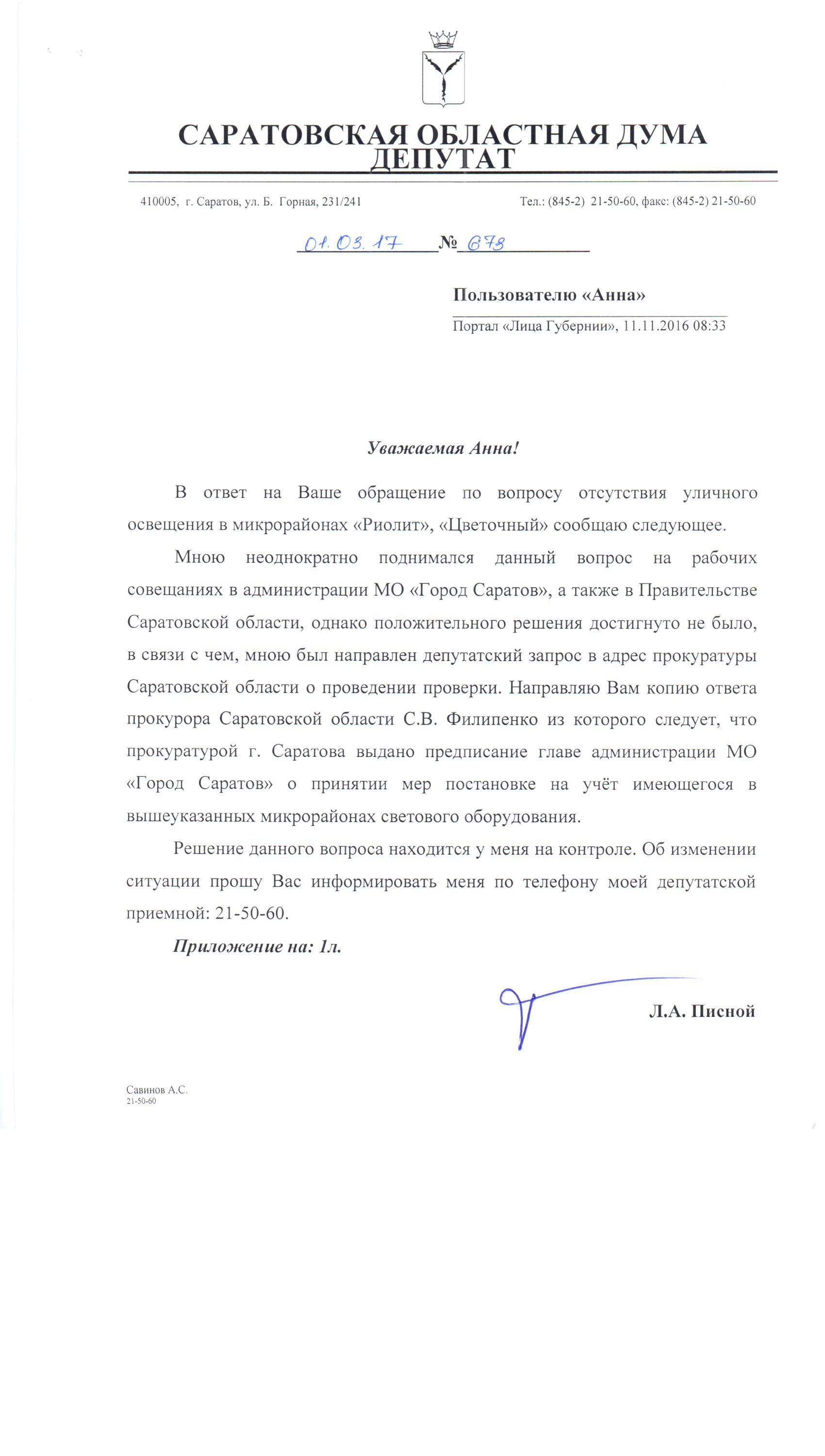 Уважаемая Анна, может быть, мне повезло так, но по личным обстоятельствам был вечером 4 ноября в районе. Столбы горели, кроме двух и нижние столбы. Буду, что в моих силах, дожимать этот вопрос, уже хоть что-то сдвинулось, хоть часть столбов загорелась. Буду чаще сам проезжать и смотреть — что ещё остаётся делать. Может быть, конечно, 4 ноября они горели в честь праздника? Поэтому просьба и к вам — как-то чаще обмениваться информацией. Для этого не надо использовать интернет, я не так часто открываю «Лица губернии», не чаще двух раз в неделю. А по телефону 21-50-60, желательно, если не сложно, чтобы вы информировали, что и как происходит.