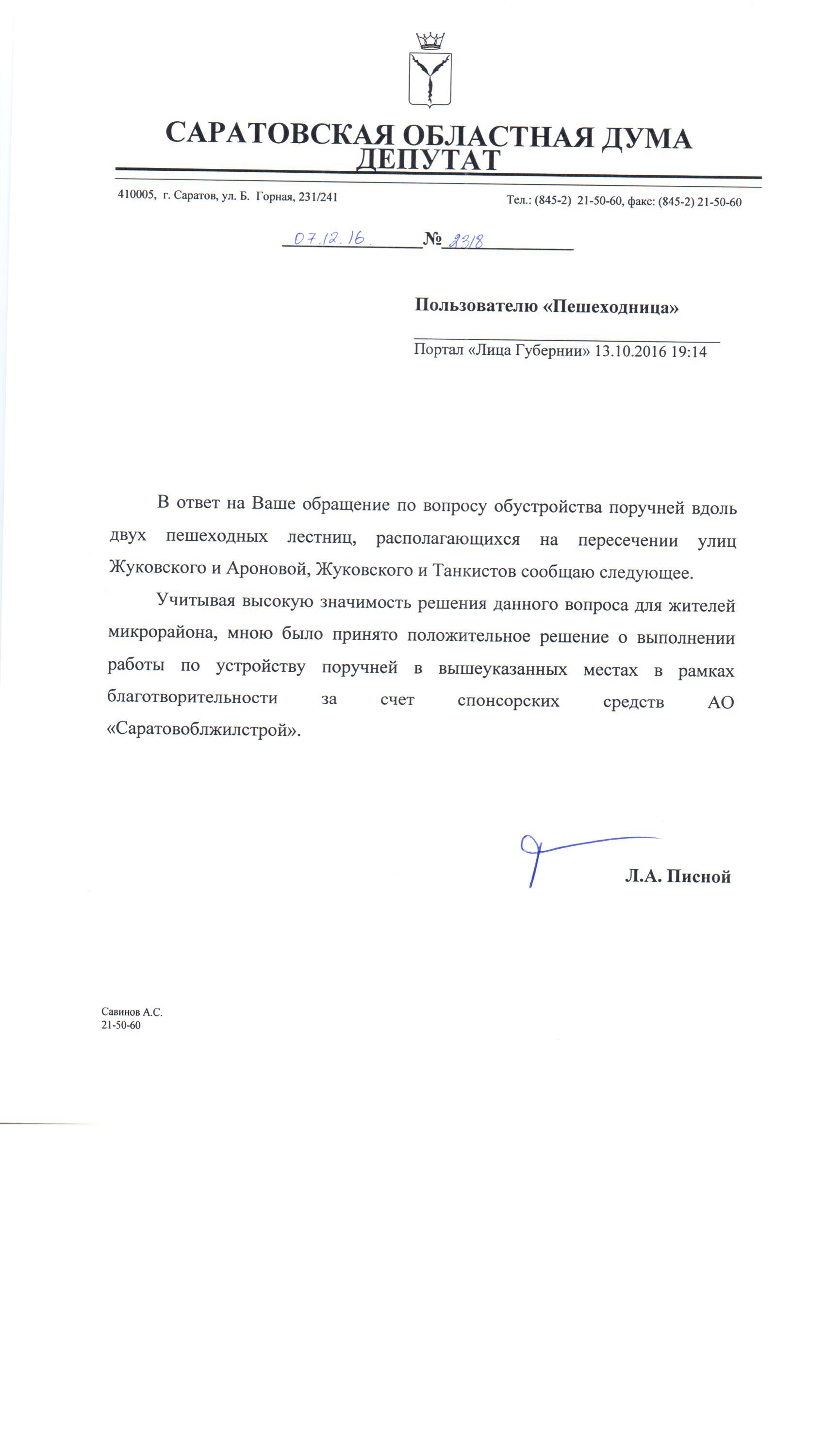 Помогите, пожалуйста! Спасибо. Леонид Александрович Писной отвечает 29.01.2016 в 10:30 Уважаемая пешеходица, по очистке лестниц возьмём вопрос на контроль. Перила, конечно, поставим, но это работа, которая в зимнее время нецелесообразна.