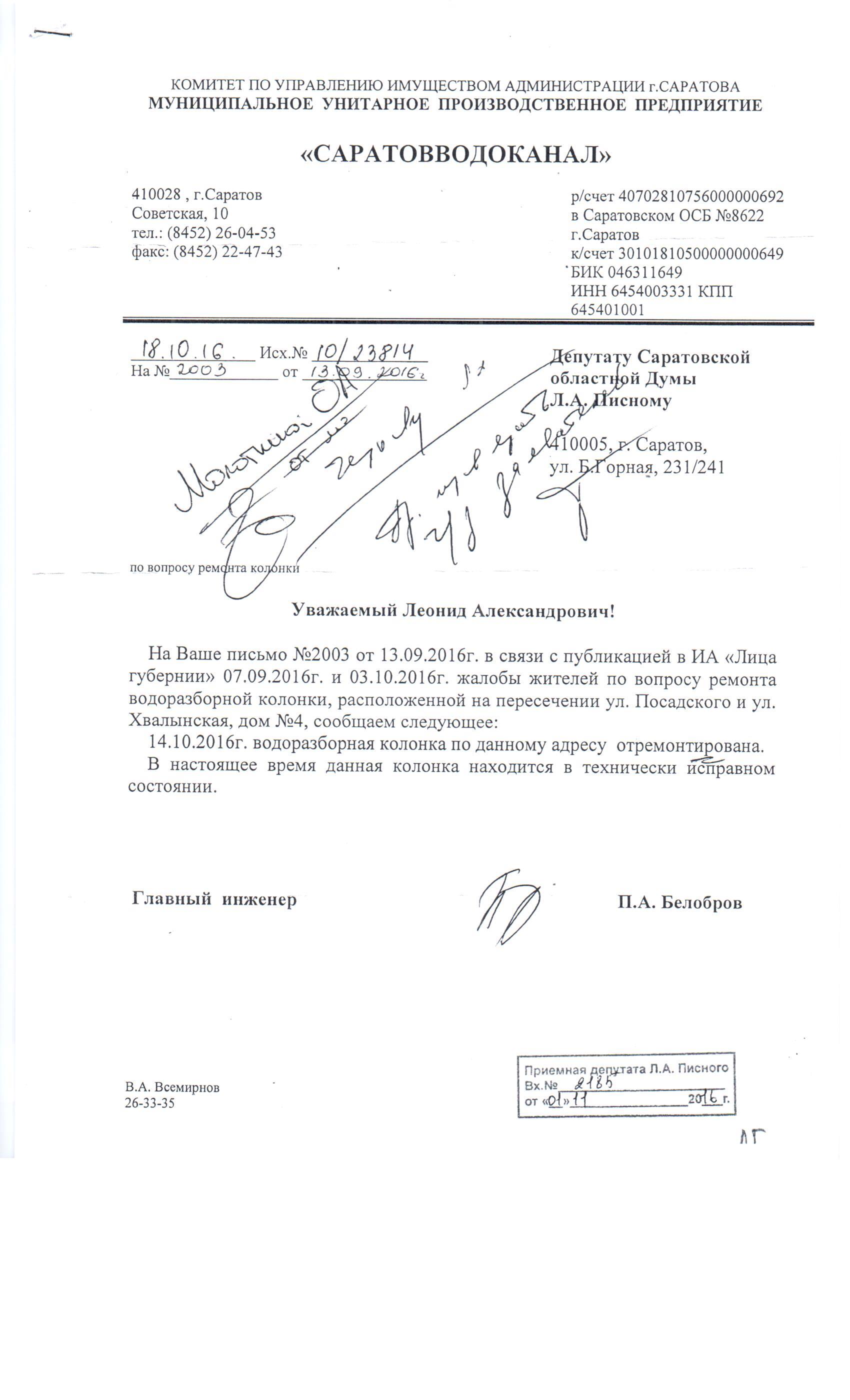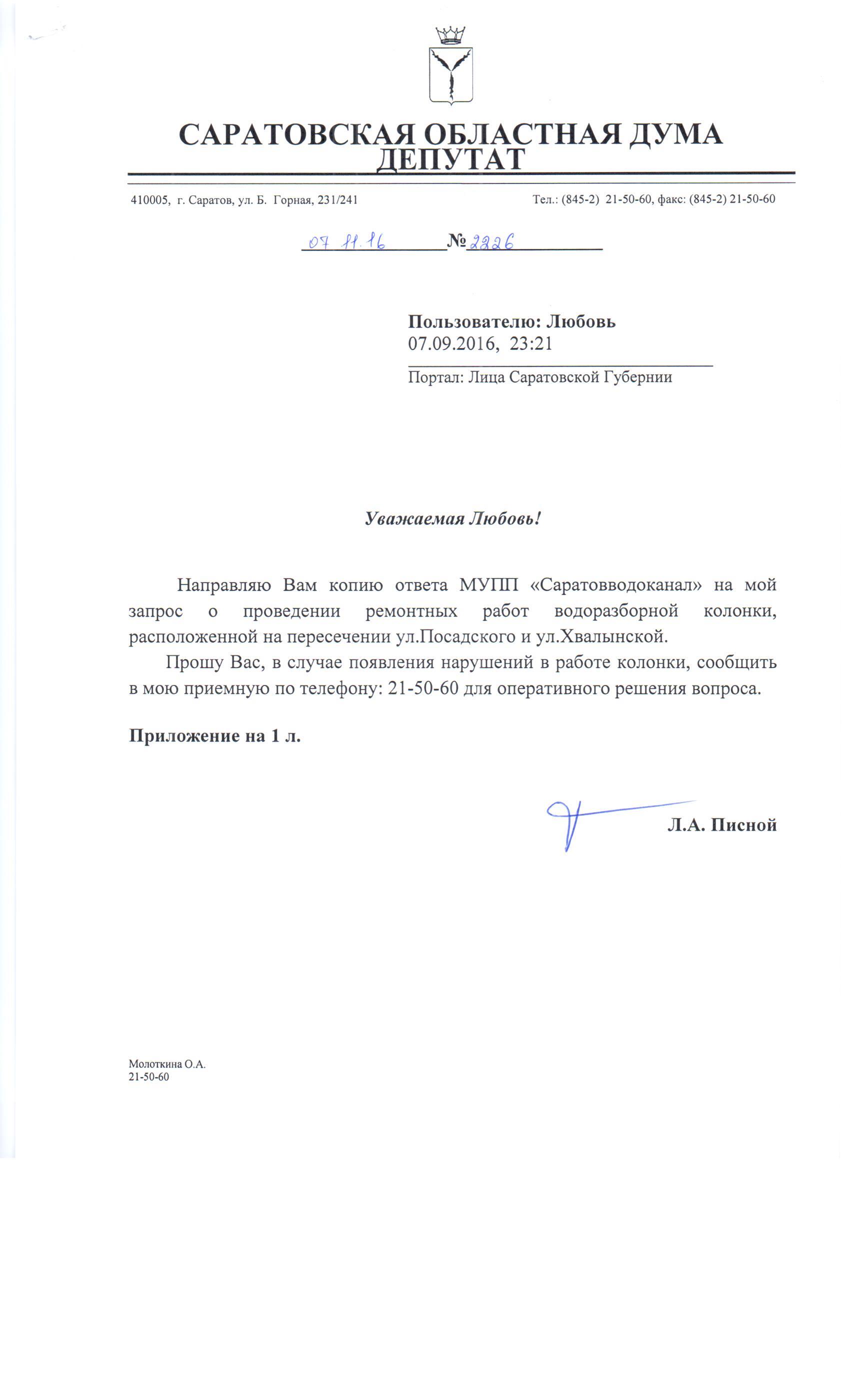 Уважаемая Любовь, подключимся к решению вопроса, свяжемся с «Саратовводоканалом», думаю, что решим проблему.