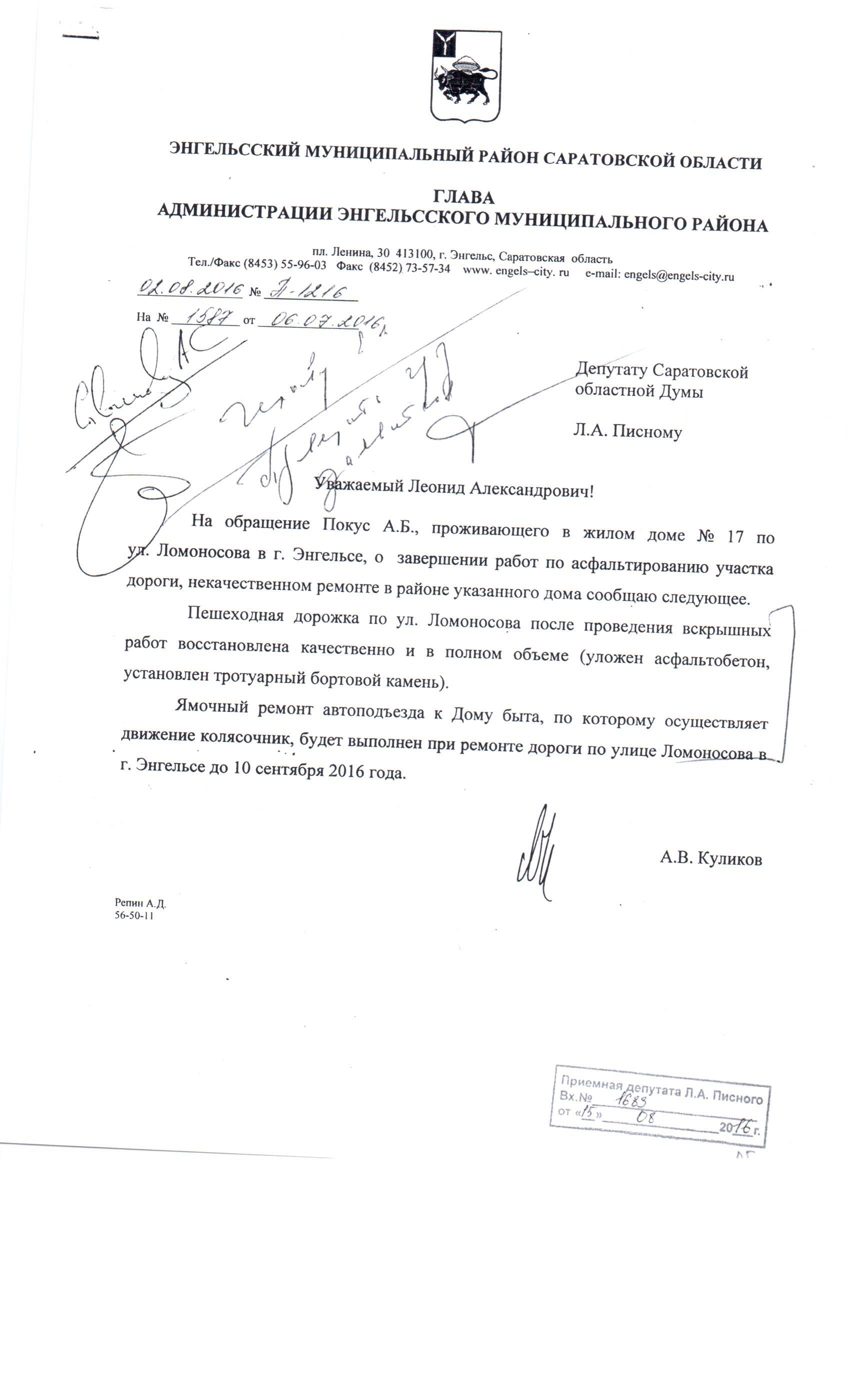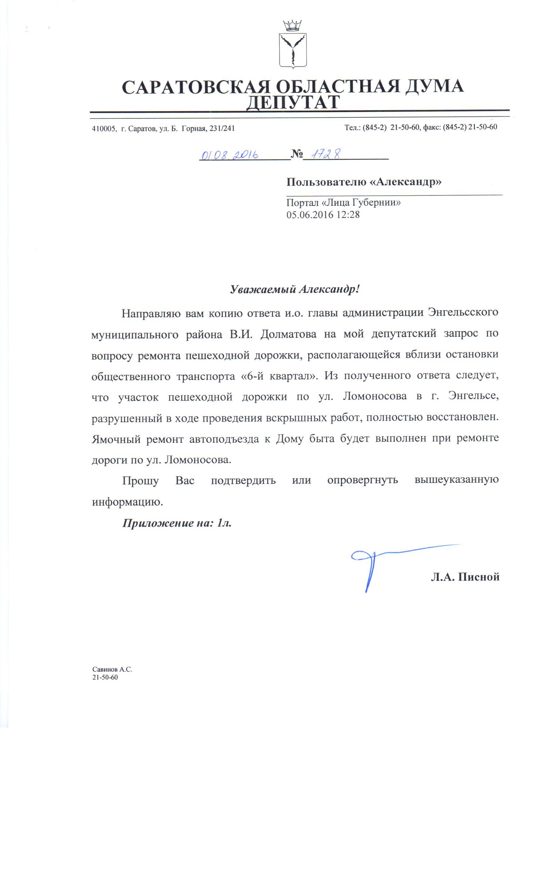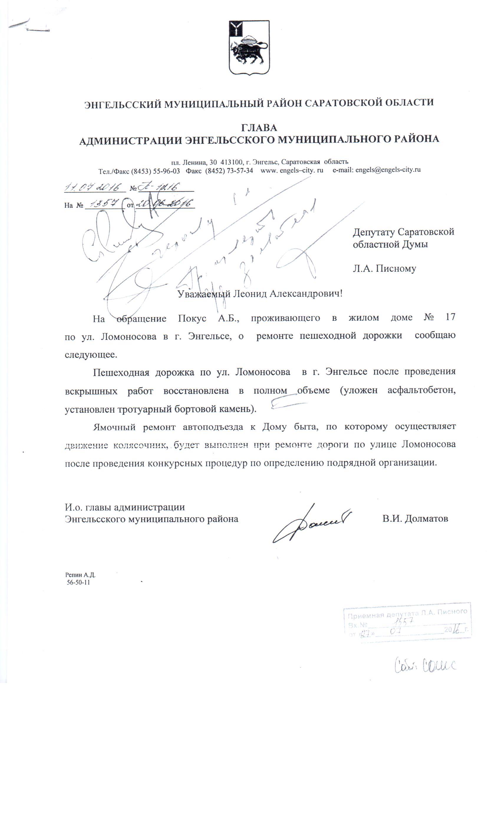 Уважаемый Александр, всё, что смогу — это я ещё раз попрошу администрацию Энгельса доделать. Но как они отреагируют, ручаться пока не возьмусь. И естественно, проинформирую вашего депутата облдумы.