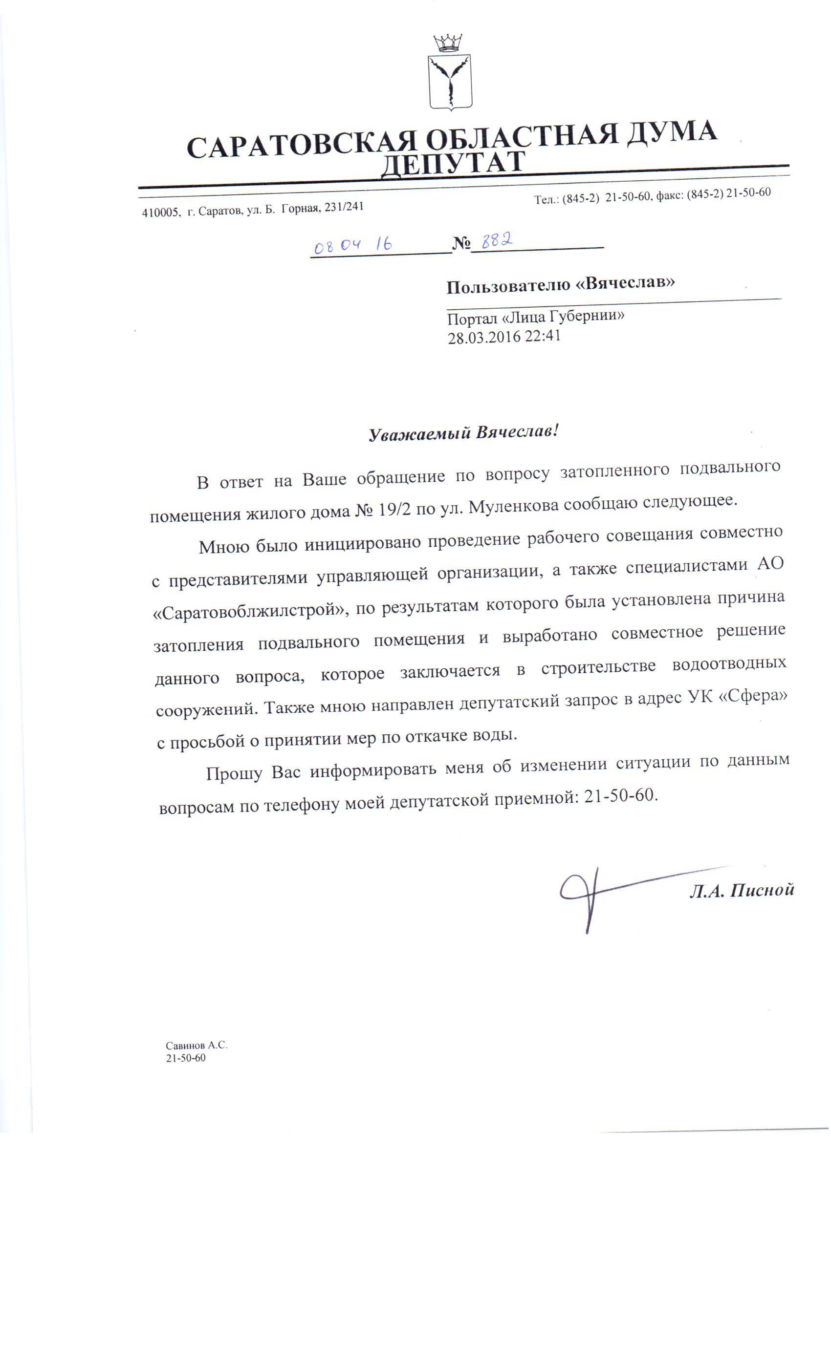 Уважаемый Леонид Александрович. Снова обращаюсь к Вам по поводу воды в подвале дома № 19/2 и 21/1 по ул. Муленкова. На Лицах губернии вы пообещали прислать своего представителя для выявления причин попадания талой воды с улицы в подвал наших домов, за что огромное Вам спасибо, но хотелось бы ускорить этот процесс: на улице теплеет, подвал сам по себе просыхает. Более недели назад я обратился письменно в УК Сфера с просьбой произвести откачку воды из подвала, но никакой положительной динамики от этой УК не последовало, Во вторник понесу им второе заявление, надеюсь может все-таки зашевелятся. Если все таки Вы пришлете своего представителя по вопросу наших домов, если не сложно, пусть он заранее свяжется со мной и я постараюсь быть дома к его приезду, чтобы все жители могли узнать результат. Заранее спасибо. Мой контактный телефон: 89093355655.