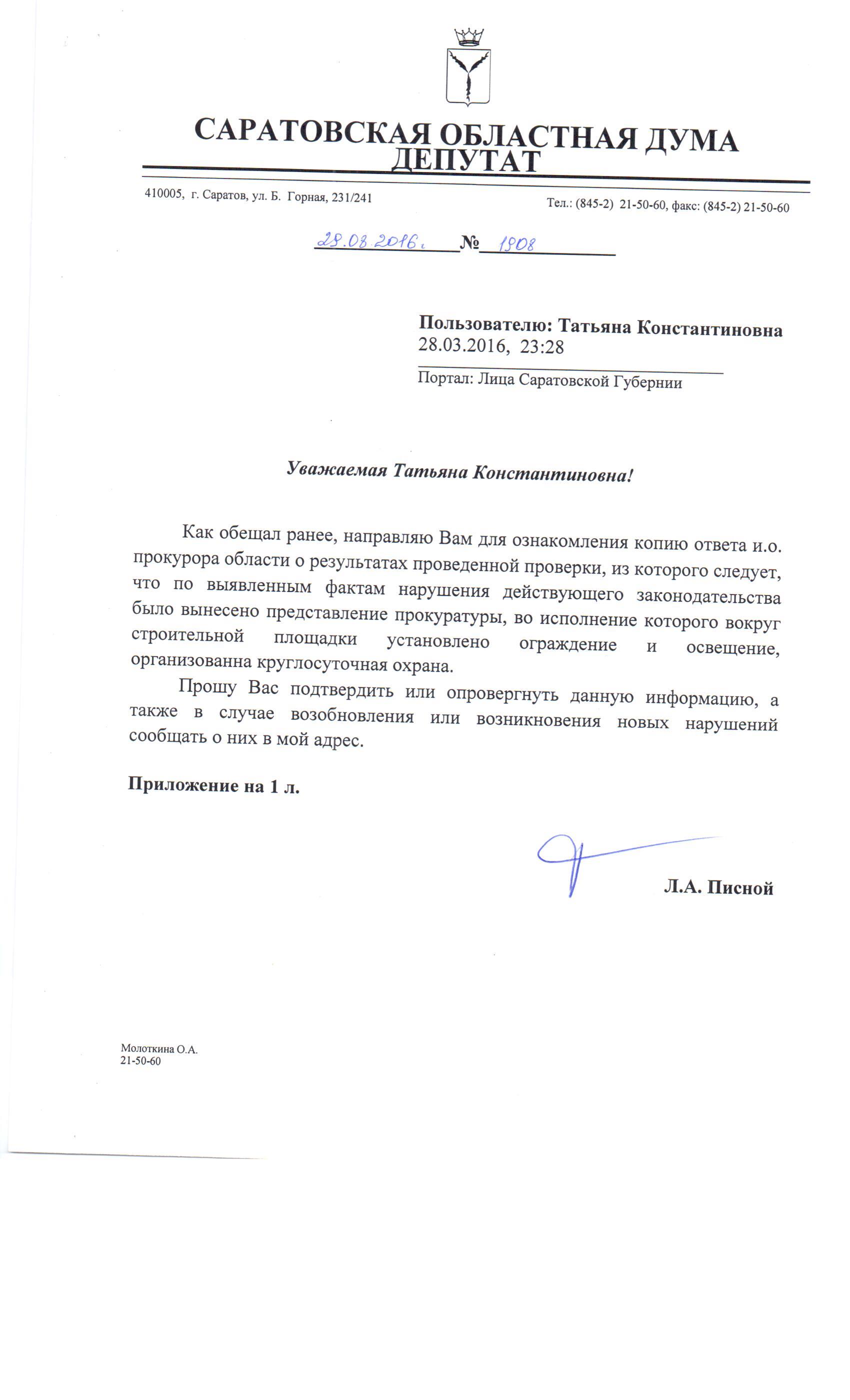 Леонид Александрович, сегодня вечером я стала очевидцем прогулки подростков по самому высокому перекрытию недостроя по 2-му Магнитному проезду (прямо рядом со школой № 73). Зимой я интересовалась в отделе по надзору за долевым строительством Минстроя, мне сказали, что у них по этому адресу недострой не числится. Что, ещё один "Био С" хотим, а потом козлом отпущения Кручинина (или другого)сделают? Почему молчит директор школы?! Какой вред уже нанесло это строительство природе, жителям и зданиям выше и ниже расположенным, это отдельная тема. Поднимите пожалуйста об этом вопрос с тем, чтобы были приняты меры, какие , Вы знаете!