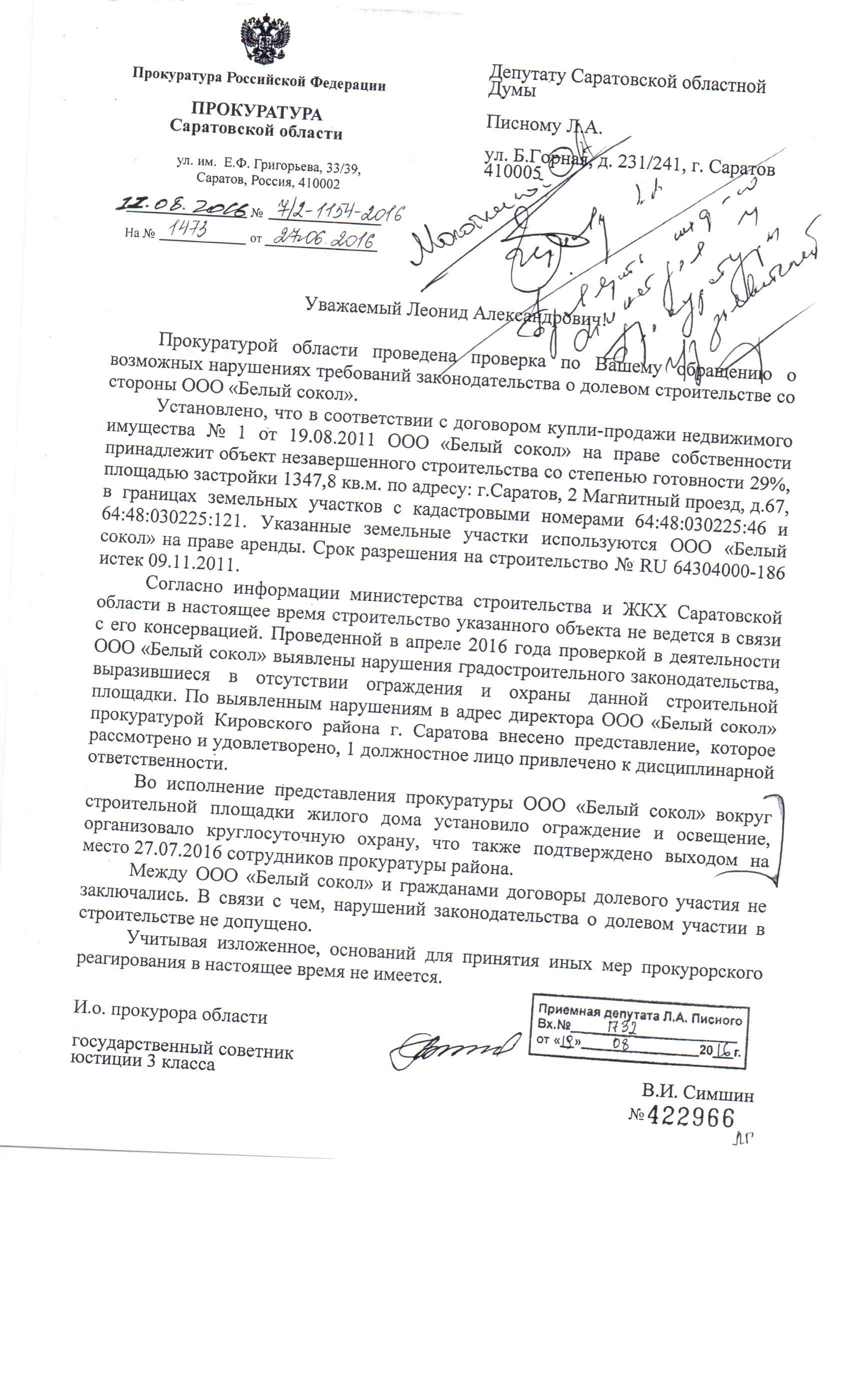 Уважаемая Татьяна Константиновна, я в курсе ситуации, которая имеет место быть на недострое, который когда-то назывался, если мне память не изменяет, «Белый орёл». Он не попал в список проблемных, потому что, по имеющейся информации, там нет нарушения прав каких-либо физических лиц. И вроде как, бывший застройщик производил строительство за свой счёт. Поэтому и в минстрое он может не числиться, и попасть в список проблемных домов он, в силу отсутствия каких-либо жалоб, связанных с нарушением прав обманутых дольщиков, не может. Но Вы абсолютно правы, что это не означает, что замороженный объект может представлять опасность. Поэтому спасибо за подсказку. Я обязательно направлю письмо по ситуации в министерство строительства и прокуратуру Кировского района.
