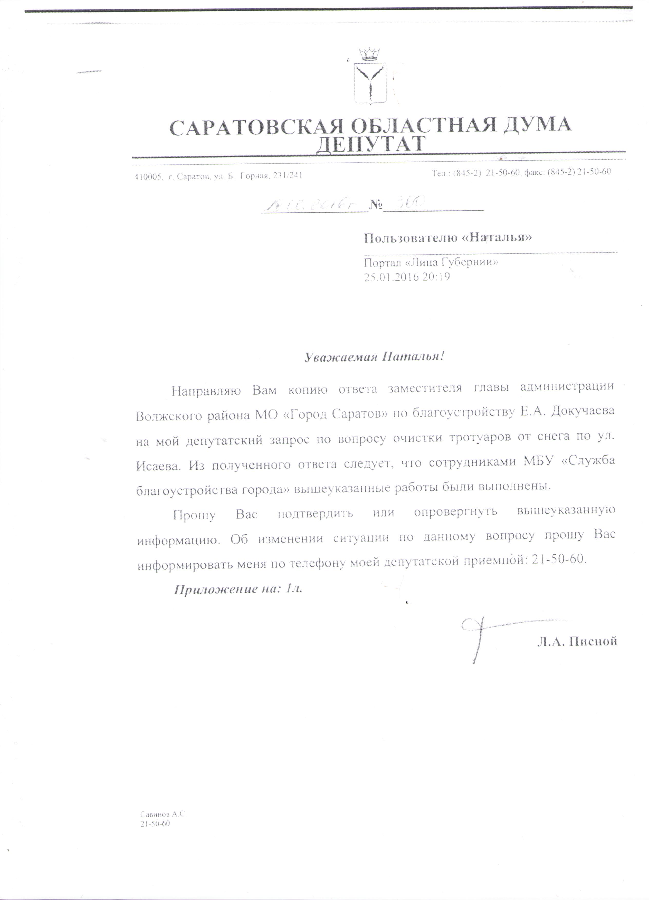 Уважаемый Леонид Александрович! Пишу от имени жителей новостроек в Юбилейном (Берёзки, Ясная поляна, Цветочный). Уже достаточно времени прошло с последнего снегопада, а пешеходных дорожек по улице Исаева по направлению к Цветочному так и нет. Дорогу для машин расчищают, а вот как быть пешеходам? После первого снегопада люди сами протоптали себе тропинки на тротуарах... а теперь всем приходится ходить прямо вдоль дороги. И дети в школы идут, и взрослые на работу. Дорога стала Уже, скользко, вечером толком и освещения нет. Машин ездит много, того и гляди попадёшь под колёса. Почему-то вся снегоуборочная техника сознательно игнорирует пешеходные дорожки. И дела никому нет. Наверное, ждут несчастных случаев. Можете Вы помочь в этом вопросе?