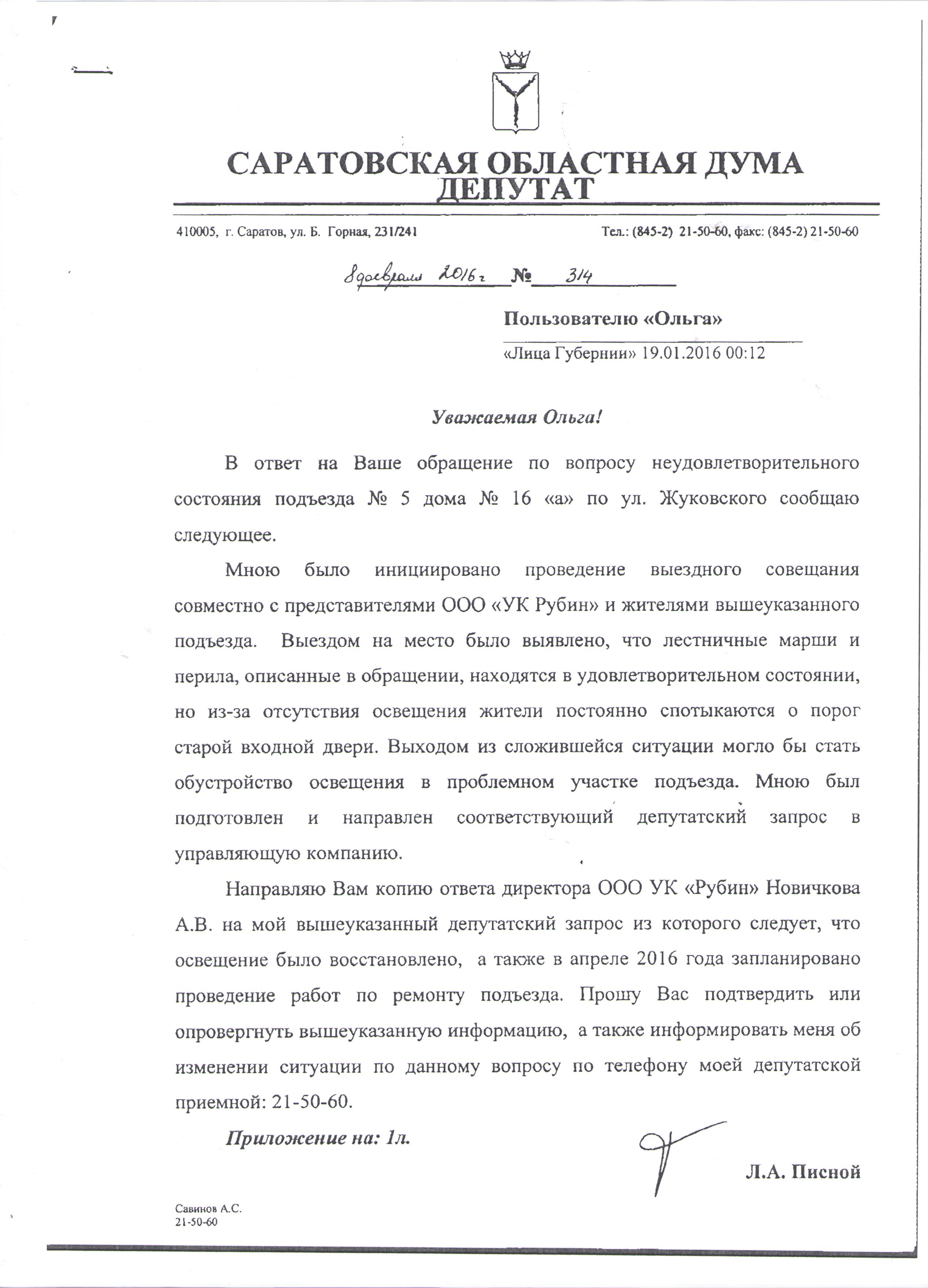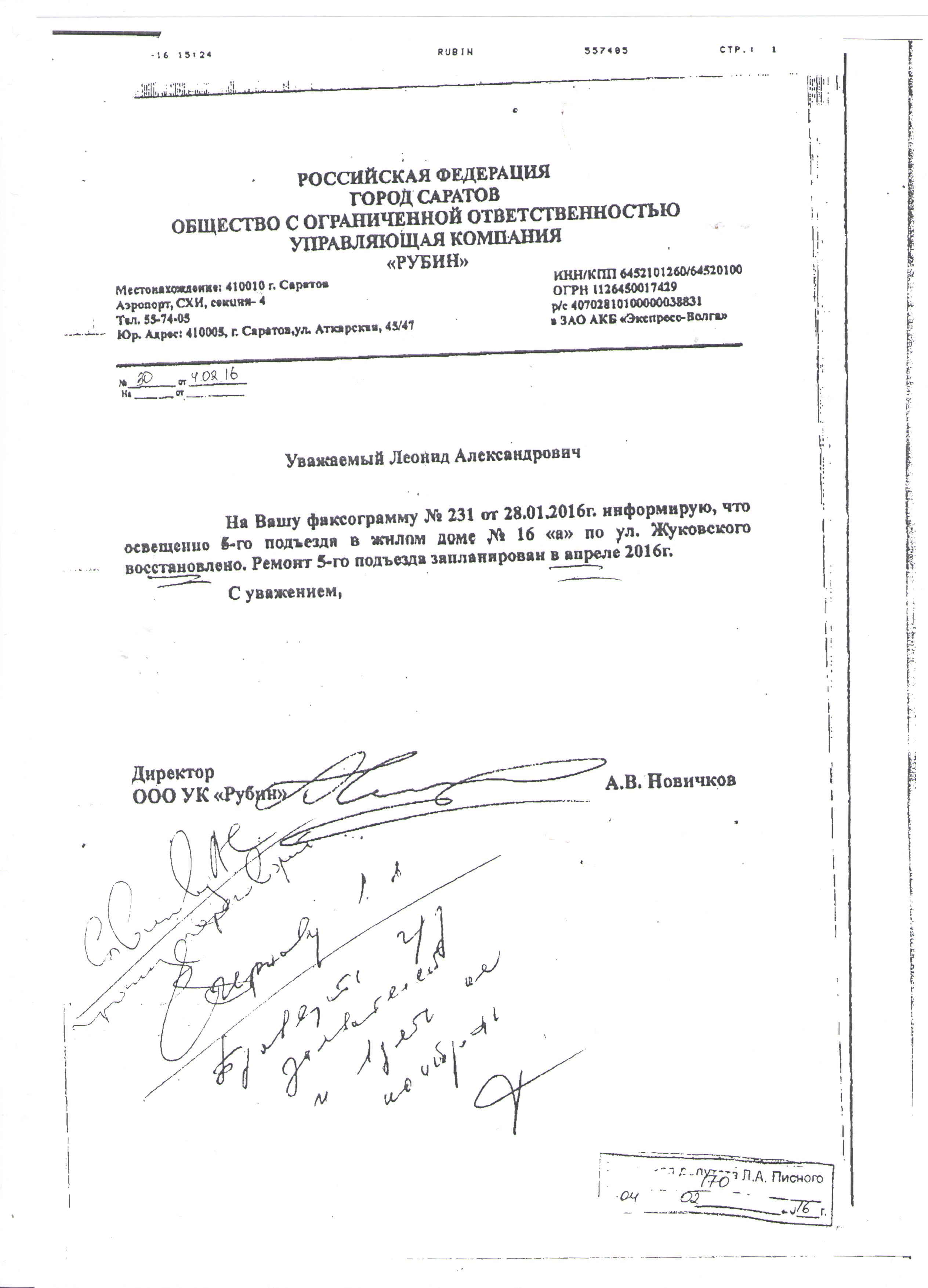 Уважаемый Леонид Александрович! Просьба оказать содействие в ремонте подъезда 5 дома 16а по ул Жуковского- дом построен в 1969 году, ремонта не проводилось со дня строительства.Ранее в устной форме обращались на протяжении последних 3-х лет, УК менялись но ремонт не проводился, теперь обратились в письменной форме и было обещано провести до конца осени,результат отрицательный, полы и лестничные марши в сколах и неоднократно были падения а в декабре упала и сломала ногу.Вся надежда на Ваше содействие.