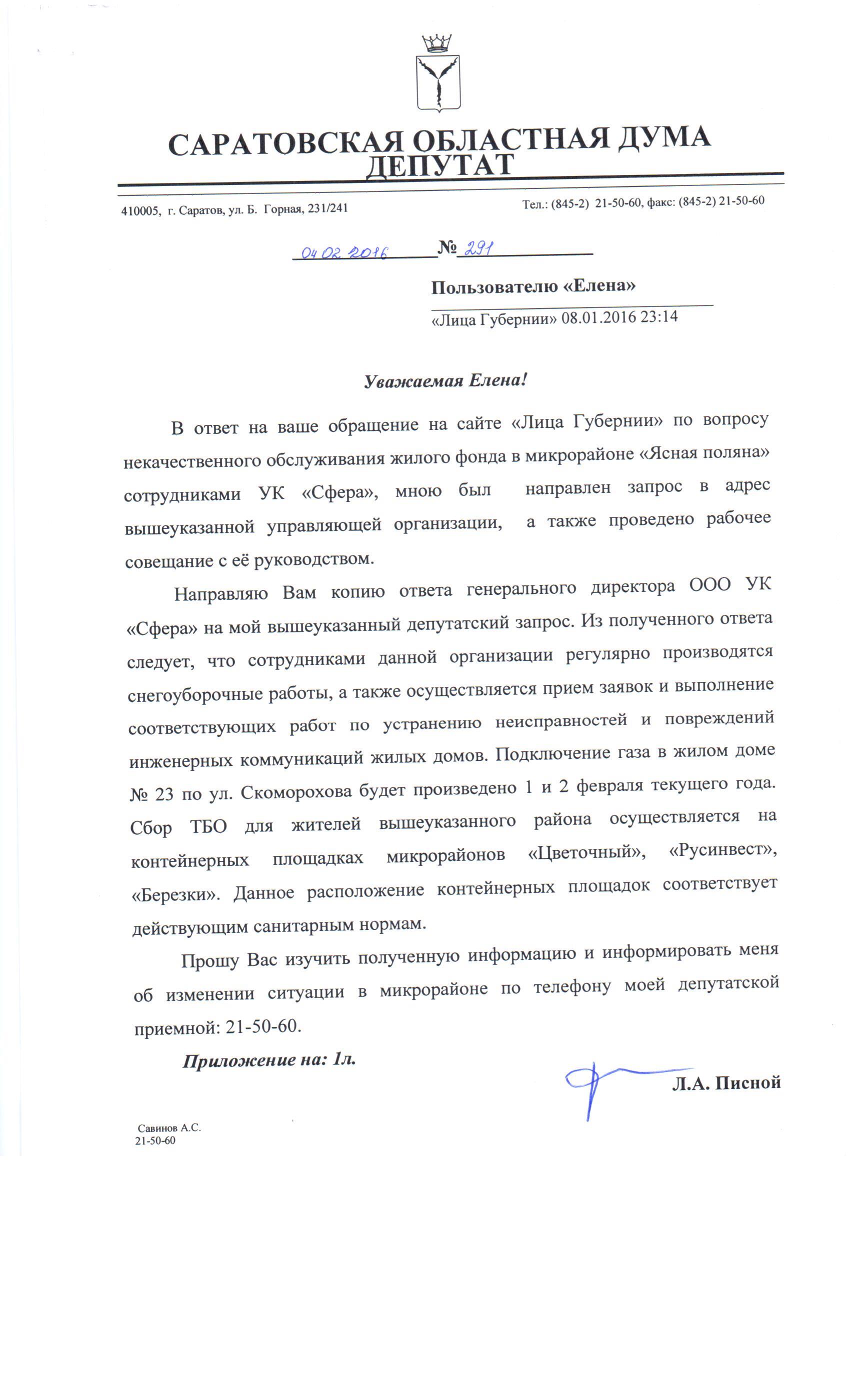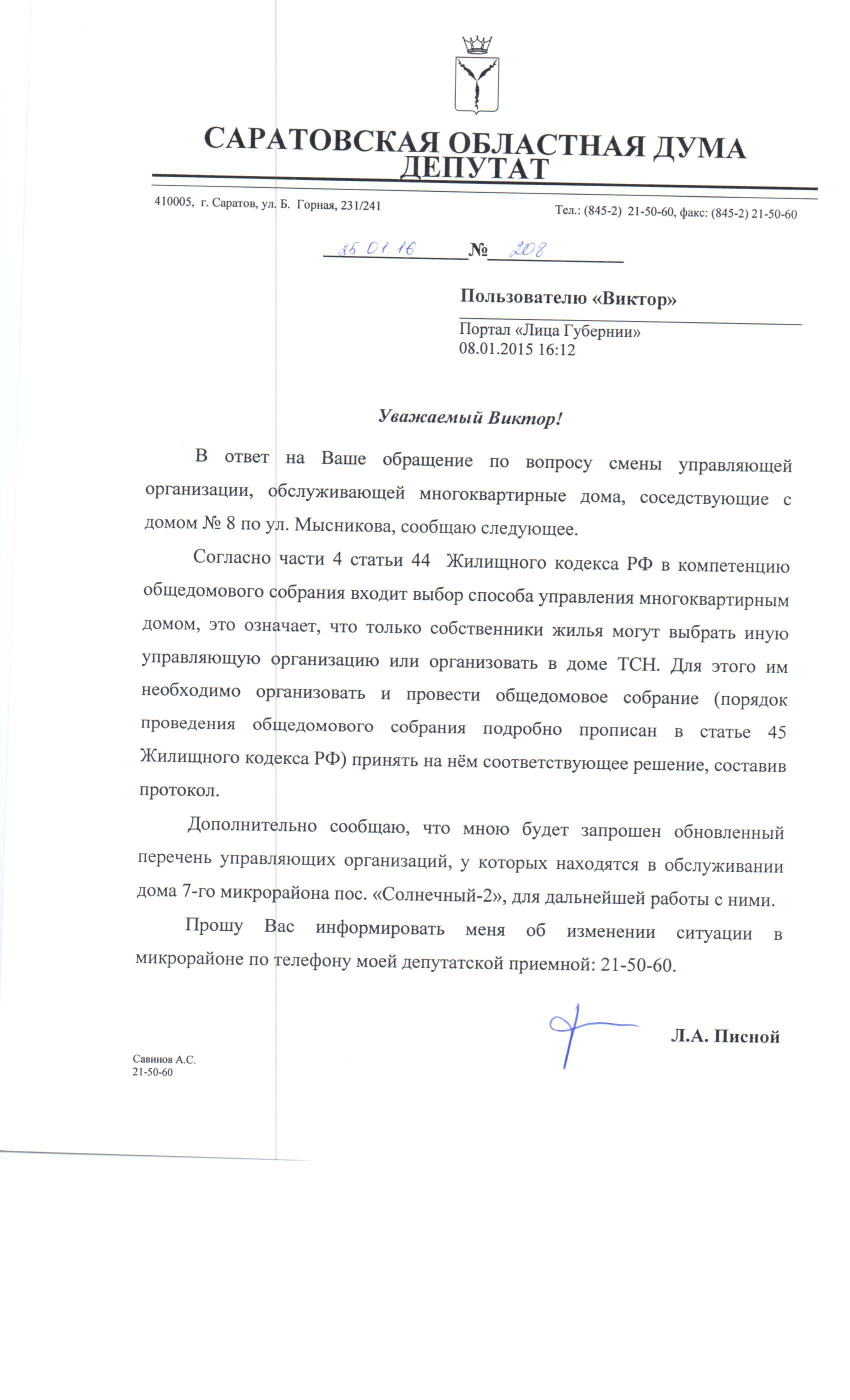 Уважаемый Леонид Александрович я проживаю в городе Саратове на Мысникова дом 8 недавно мы совместно сменили управляющею компанию и теперь нашими домами управляет ООО Умный Дом компания и руководство мне нравится многое делают и выполняют все поставленные задачи по улучшению нашего проживания и снижению затрат. вопрос вот в чем в нашем 7 микрорайоне остались несколько домов у предыдущей компании ООО УО Люксжилсервис которые не только портят весь вид (мусор у них не убирается, снег не чистится канализация постоянно забита) и все это остается без какого либо внимания. Леонид Александрович не могли бы вы оказать какую либо посильную помощь и убрать ООО УО Люксжилсервис из нашего поселка и помочь развиться молодой и порядочной компании ООО Умный Дом, я уверен они Вас не подведут. С Уважением к Вам житель города Саратова активист 7 микрорайона поселок Солнечный Виктор.
