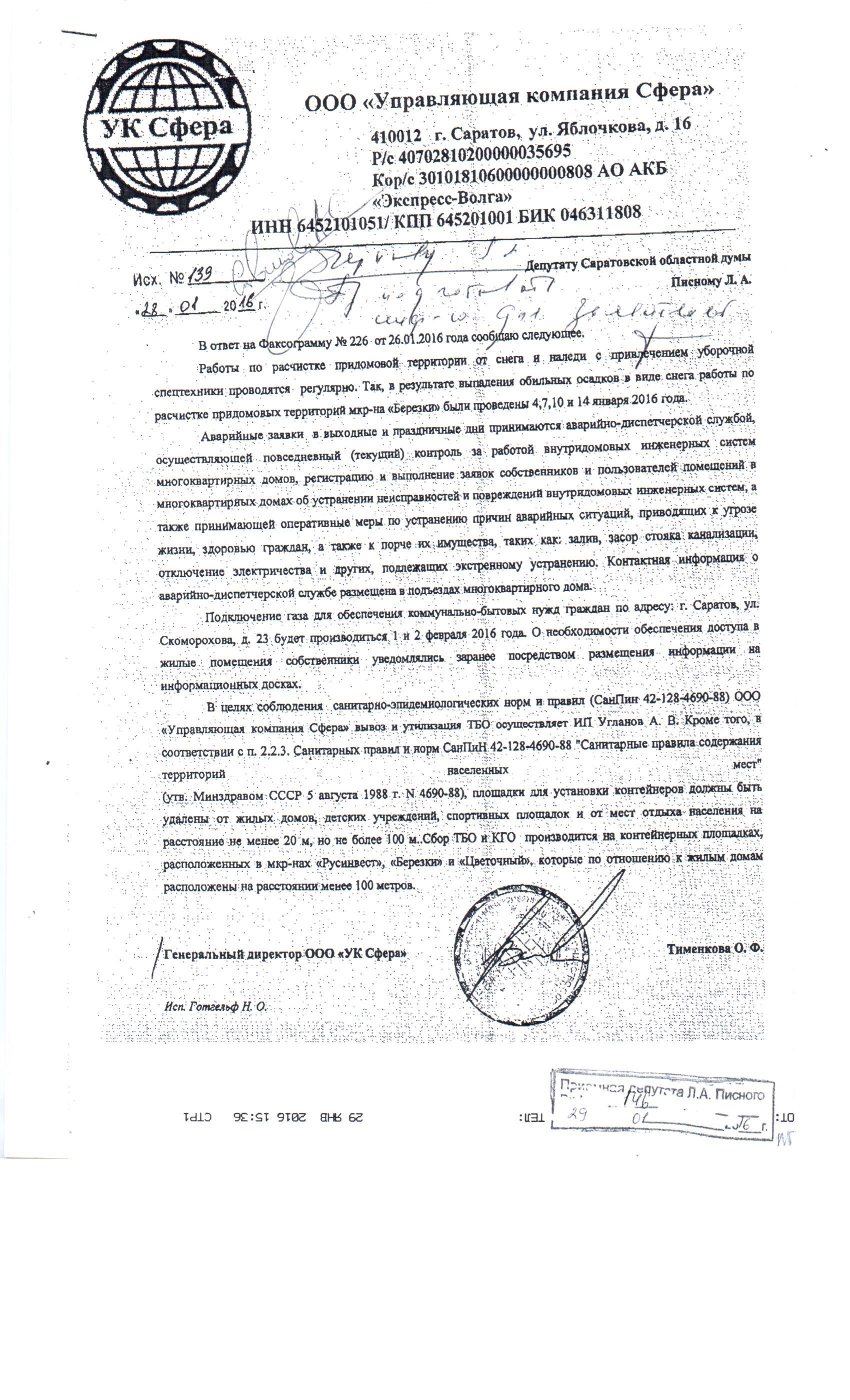 Доброе время суток, уважаемый Леонид Александрович! Уже в отчаянии!!! Пишу Вам не первый раз. На время новогодних праздников (почти половину месяца) вообще никто не реагирует на проблемы жильцов. Последней каплей стал только что случившийся со мной инцидент. Я открыла дверь в подъезд, а на меня с крыши рухнула огромная глыба замерзшего снега, а это высота 6 этажа!!! Чудом не пробила голову (видели несколько соседей). Столько времени шел снегопад, а УК не потрудилась обезопасить жильцов!!! Кроме того, наши соседи (Газовая,24, кв. 24 со 2 числа сидят без воды с грудным ребенком, протечка от соседей выше, начальник уч. сказала, что на больничном и ей плевать!!!больше невозможно никуда дозвониться!!! На Скоморохова23, 1 подъезд все праздники нет света на 1 этаже, из-за этого не работает домофон (нет электричества именно в этом щитке), не посыпают!!! Почти не чистят!!! Мусорки так и не поставили, лифты не пустили, газ обещали до НГ и пропали!!!!! Зато платежка за весь месяц да еще какая!!! За что?!!! Просим всей "ЯСНОЙ ПОЛЯНОЙ"! Примите ПОЖАЛУЙСТА меры в отношении данного произвола!!! Мы в свою очередь активно готовим документы в суд. Я по поводу обвала снега подам отдельный иск. Просим только помочь нам в данном процессе. Заранее спасибо. Жители "Ясной поляны". К.т. 89631121222