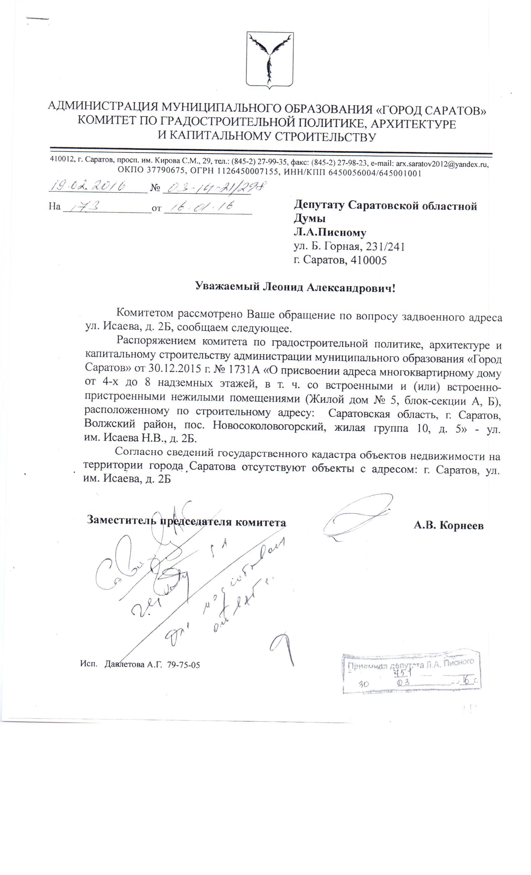 Уважаемый Леонид Александрович! Дом 5 ЖСК "Свой дом" 30 декабря 2015 года ввели в эксплуатацию. Ура!!! Спасибо за содействие! Как Вы пояснили, нашему дому был присвоен почтовый адрес ул. Исаева, д.2Б. Та же информация была расклеена на дверях наших двух подъездов. Однако оказалось, что дом с таким точно почтовым адресом уже есть и находится в 150 метрах от нас на пересечении улиц Исаева и Муленкова. На воротах этого дома имеется табличка с указанным адресом, 18 отделение почты обслуживает по данному адресу именно этот дом. Поясните, пожалуйста, как быть с таким задвоением адреса? Кто за это отвечает? Кто должен исправить такую ошибку, и к какому из домов эта ошибка относится? И где уточнить почтовый адрес нашего дома? С уважением, Шоломова Елена.
