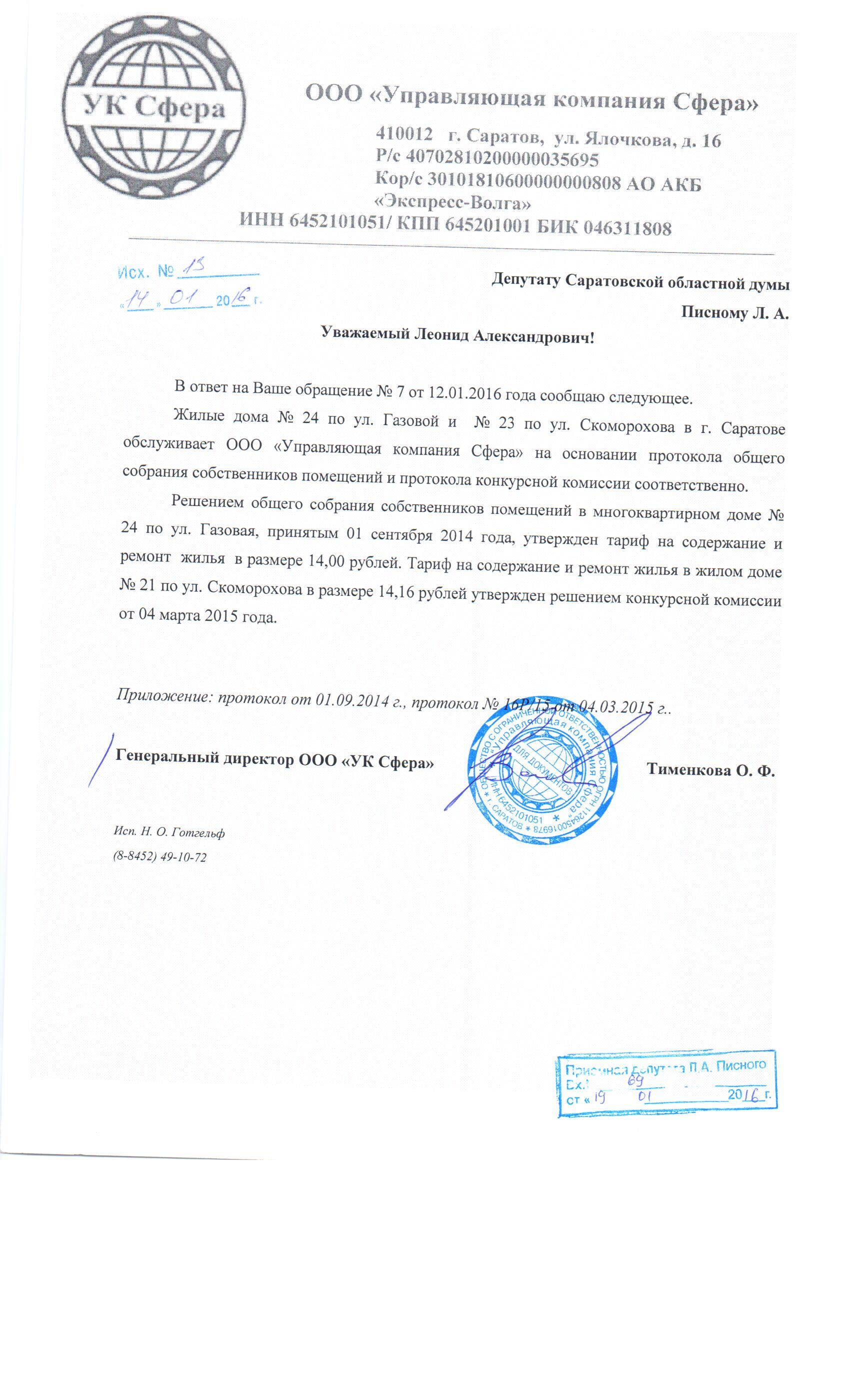 Уважаемая Елена, я, конечно, запрошу «Сферу», но так как являюсь законодателем, могу предполагать следующее, что Газовая, 24 была передана «Сфере» в обслуживание раньше. И тогда передача осуществлялась на основании договора между застройщиком и управляющей компанией. После чего тариф устанавливался управляющей компанией по согласованию с собственником. Ну или, по крайней мере, при наличии такового хотя бы на бумаге. Дом Скоморохова, 23 уже передавался управляющей компании по результатам открытого конкурса, который проводит администрация Саратова. В условиях конкурса стоимость формирует администрация. И поскольку эта система формирования цены достаточно «мутная», поэтому 18 рублей за квадратный метр, вероятнее всего, было записано в условиях конкурса. Поэтому УК «Сфера», победив в этом конкурсе, естественно, обязана выполнять условия и предъявлять гражданам тот тариф, который был записан. Но действует он ровно, по-моему, 12 месяцев, после этого граждане имеют право провести собрание и принять тот тариф, который управляющая компания им разъяснит. Срок годовой заканчивается, по-моему, или в августе, или в сентябре 2016 года. Поэтому просьба — к лету связаться с нами, мы совместно со «Сферой» проведём совещание и найдём какое-то решение. А обоснования я в «Сфере» обязательно запрошу и Вам его перешлю.