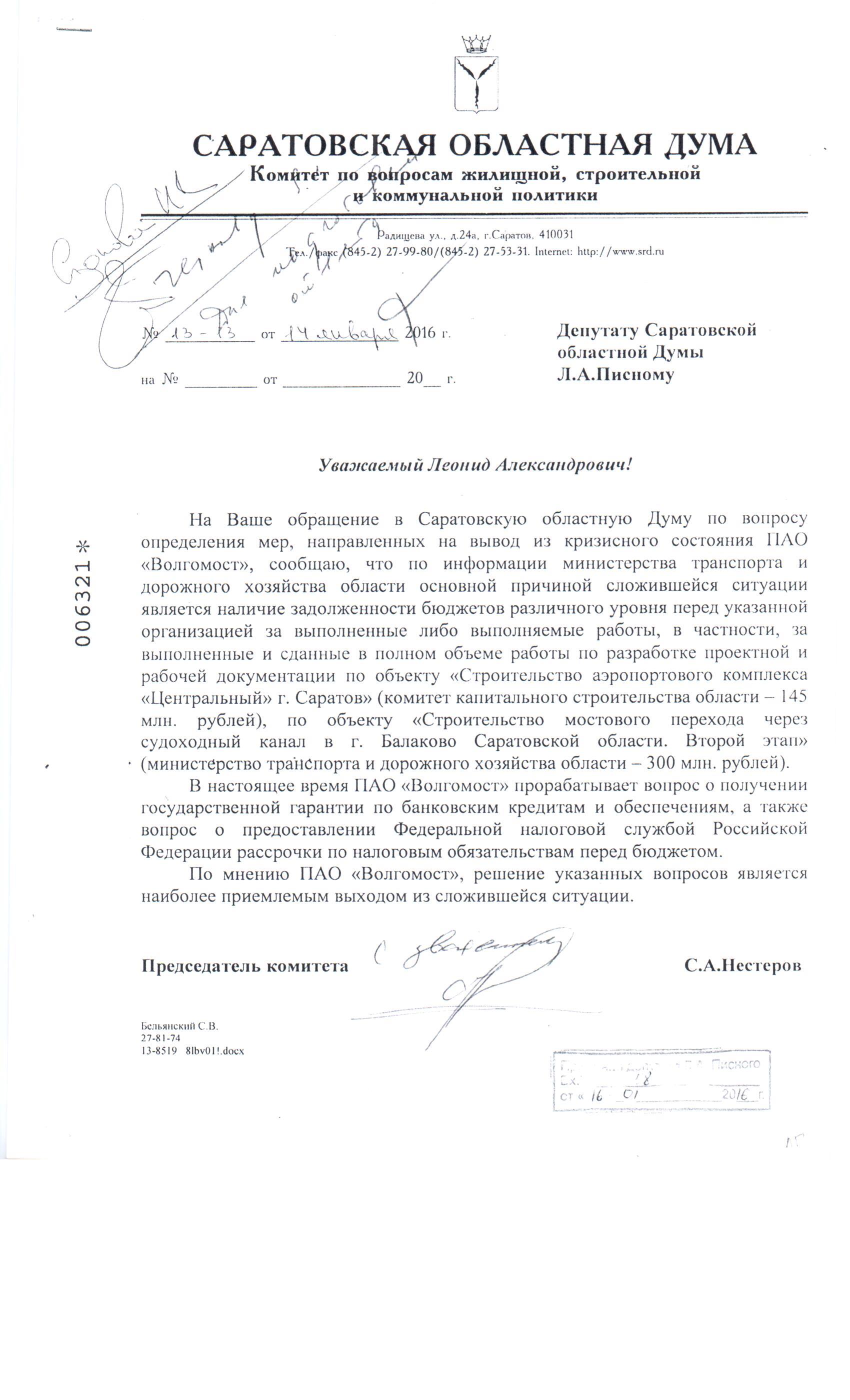 Уважаемый Виктор, я смотрю за ситуацией, связанной с «Волгомостом». Мне точно так же безумно жаль, но не хочу, чтобы Вы питали какие-то иллюзии. Ситуация, связанная с банкротством и вообще с экономикой таких крупных предприятий, она не решается спонтанно. Поэтому всё, что я Вам обещаю, это я обращусь к руководителю профильного комитета думы Нестерову, чтобы он попробовал организовать совещание вместе с правительством на тему ситуации с «Волгомостом». Если получится — по крайней мере, мы хоть будем иметь картинку, что и как там происходит.