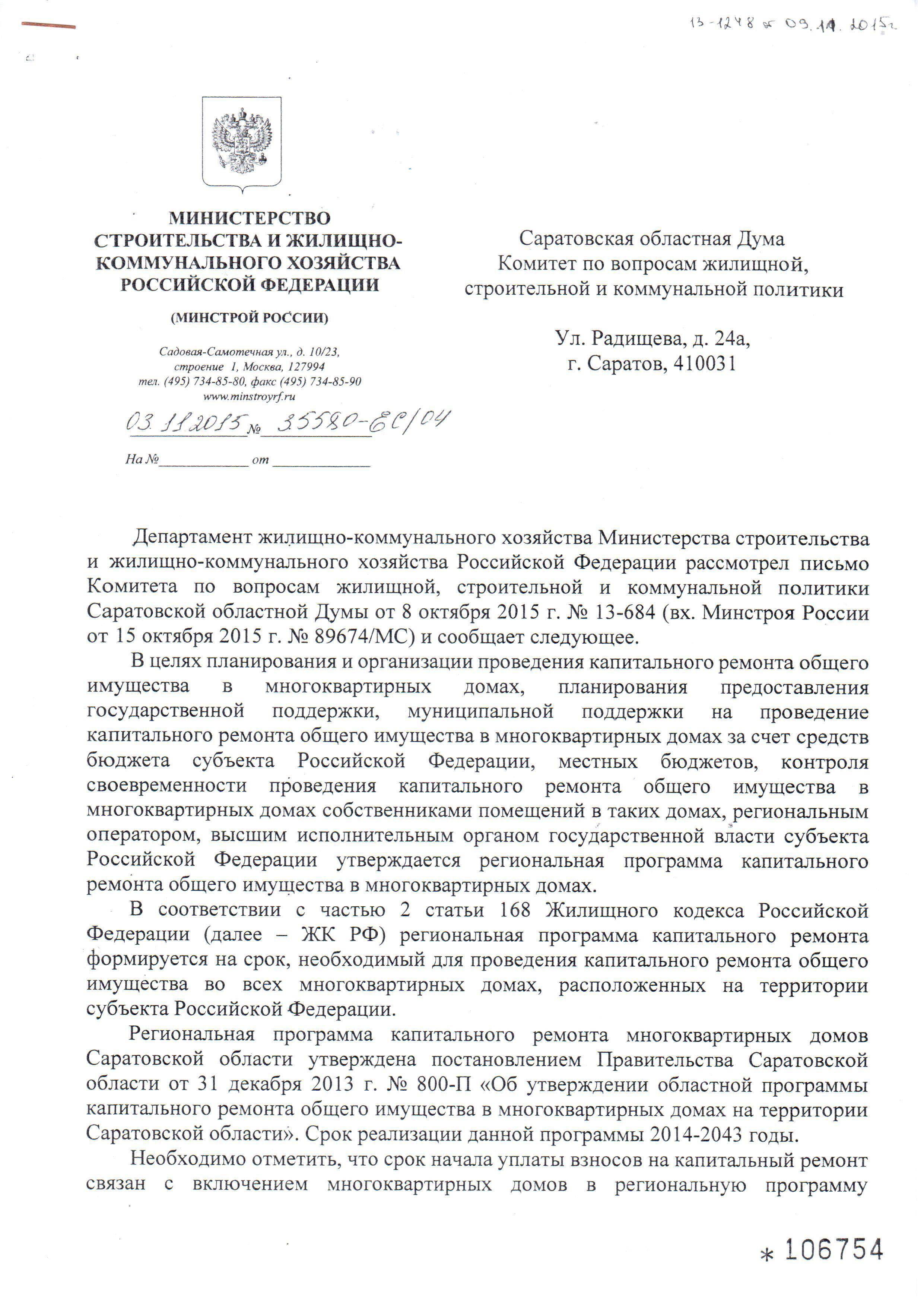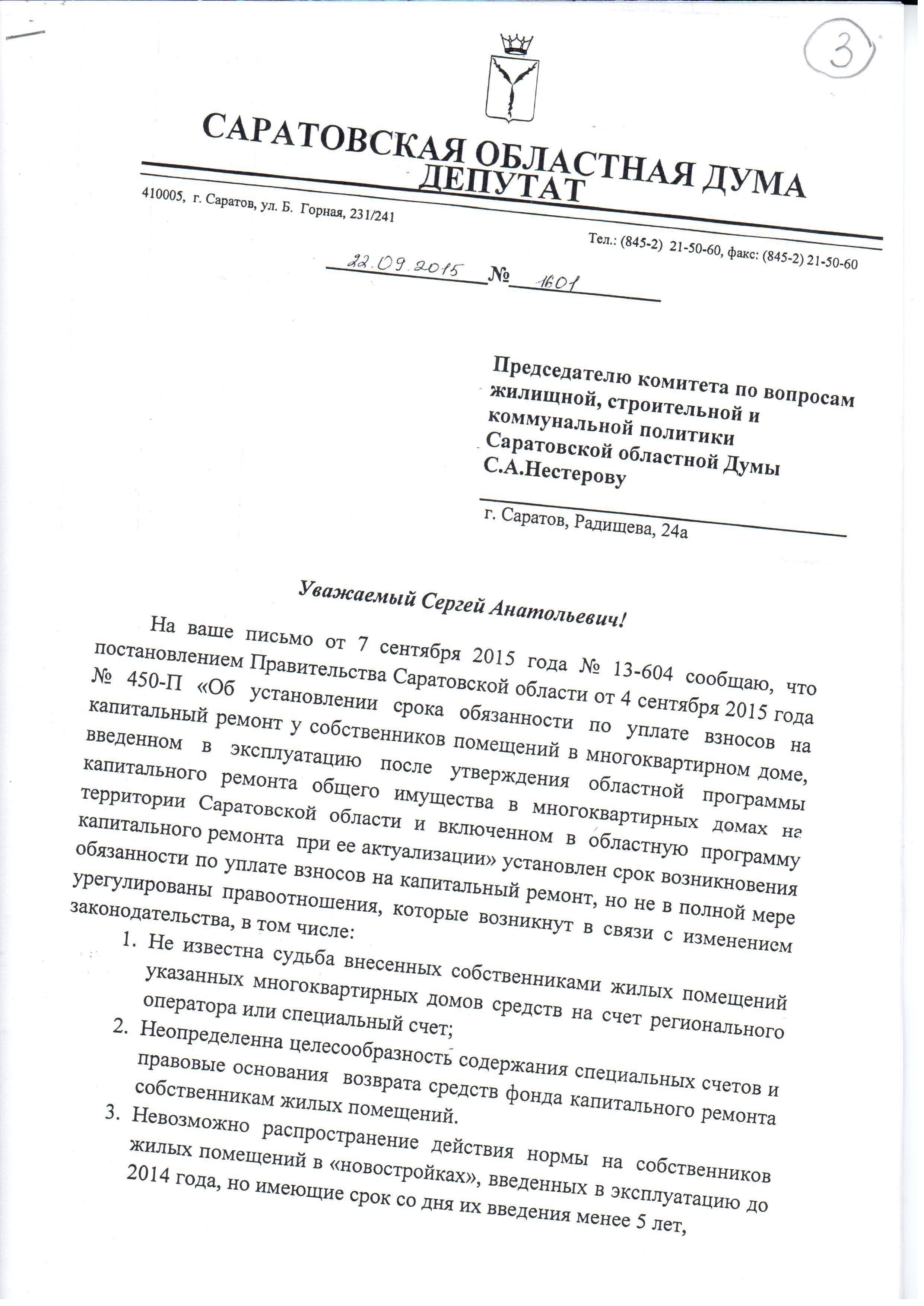Уважаемая Анна Михайловна, вообще-то «Саратовоблжилстроем» пока руковожу я. И могу Вам сказать, что каких-либо таких договоров на ремонт 750 тысяч быть не должно. Потому что у «Саратовоблжилстроя» были договорные обязательства по строительству данного дома без отделки. Да, иногда мы идём навстречу участникам долевого строительства, как правило, это те, у кого жизненный уровень оставляет желать лучшего, или это ветераны разных категорий, и не взимая никакой платы, за свой счёт производим им отделку нежилых помещений, как это называется, в муниципальном исполнении. Да, ещё бывали случаи, когда разово люди просили сделать отделку по допдоговору, но, как правило, стоимость таких работ составляет в пределах где-то около 1000 рублей на квадратный метр площади. Поэтому если это однокомнатная квартира, соответственно, это где-то 40-45 тысяч, двухкомнатная квартира, соответственно, 55-70 тысяч, трёхкомнатная — не больше 100 тысяч. Поэтому меня очень заинтересовала Ваша информация и очень бы хотелось понять, какие документы у Вас есть. Потому что пока, если честно Вам сказать, я так подозреваю, что кто-то просто «крышуясь» нашим названием, Вас, попросту говоря, обманывает. Поэтому или каким-то образом обеспечте эти документы мне для проверки и дальнейших действий, или постарайтесь попасть на очередной приём, для того чтобы мы с Вами пообщались и чтобы я понял, что происходит у Вас в квартире.