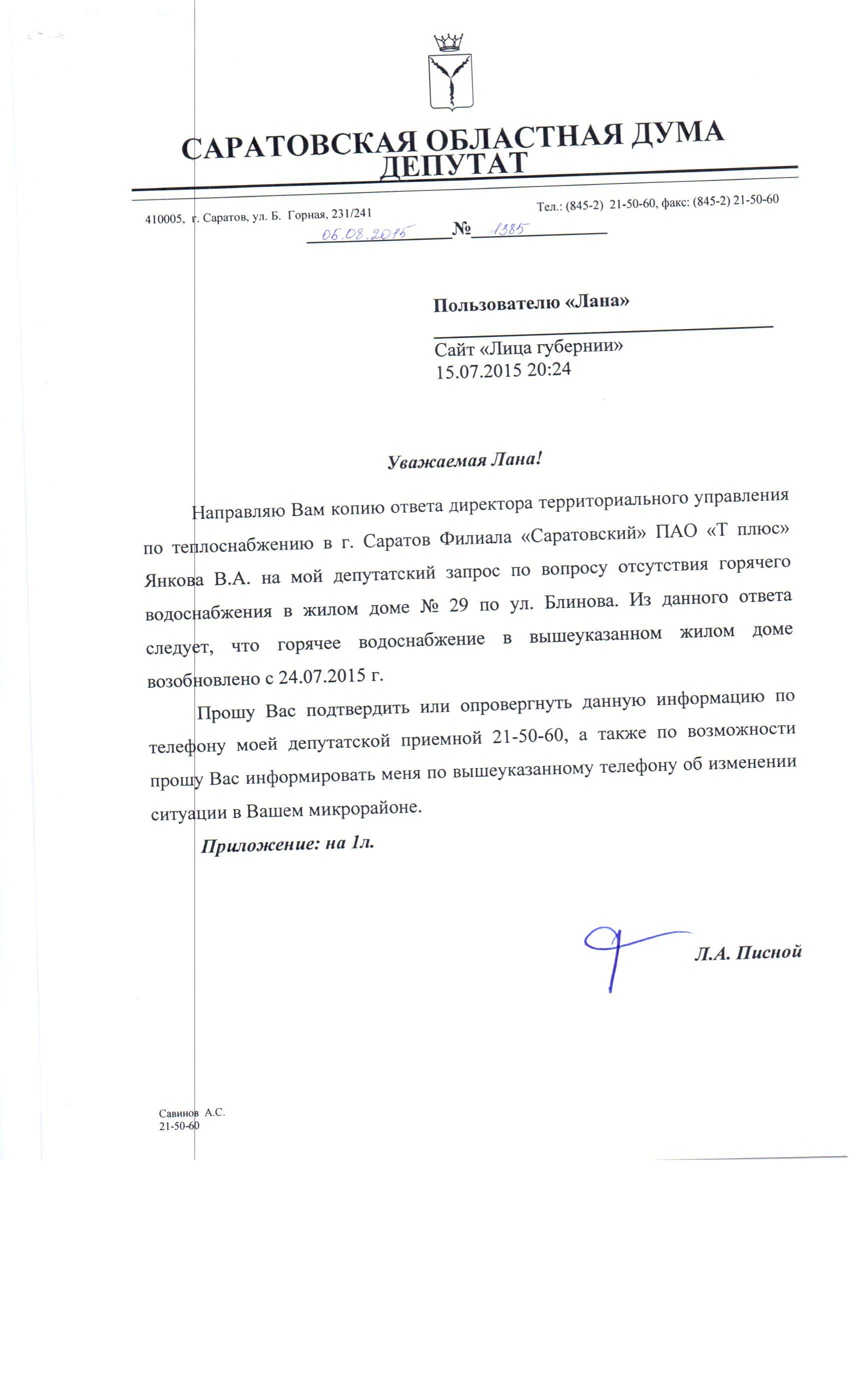 Уважаемый Леонид Александрович!!! Я понимаю что Вы уже не однократно отвечали на наши письма по поводу сдачи дома №14 по ул Зыбина,но сдвигов до сих пор никаких,сколько ещё мы будем скитаться по квартирам?Нашла Ваш ответ ещё в 2013 году Леонид Александрович Писной отвечает 17.07.2013 в 11:48 Уважаемая Венера, я обязательно запрошу всю информацию по Вашей ситуации в «Стройинтерсервисе». Думаю, что мой коллега Вячеслав Булатов будет со мной откровенен, но вообще, конечно, помимо адреса, по которому, естественно, он даст информацию, и если Вы прочитаете ответ выше, то поймёте, что исполнение обязательств обеспечивается КПСО «Госжилстрой», и я объяснил, что это «железобетонная» гарантия. Мне, конечно, желательно Вашу фамилию или адрес квартиры. Или организацию, у которой Вы покупали. Если Вам неудобно или некорректно это слать через интернет, то позвоните в приёмную, 21-50-60. Или мимоходом зайдите в офис «Саратовоблжилстроя» на первом этаже, где в депутатской приёмной оставьте заявление. И всё, что будет возможно в моих силах, мы Вам поможем.,,,,,Как видите прошло уже два года! Так когда же эта ЖЕЛЕЗОБЕТОННАЯ ГАРАНТИЯ осуществится?