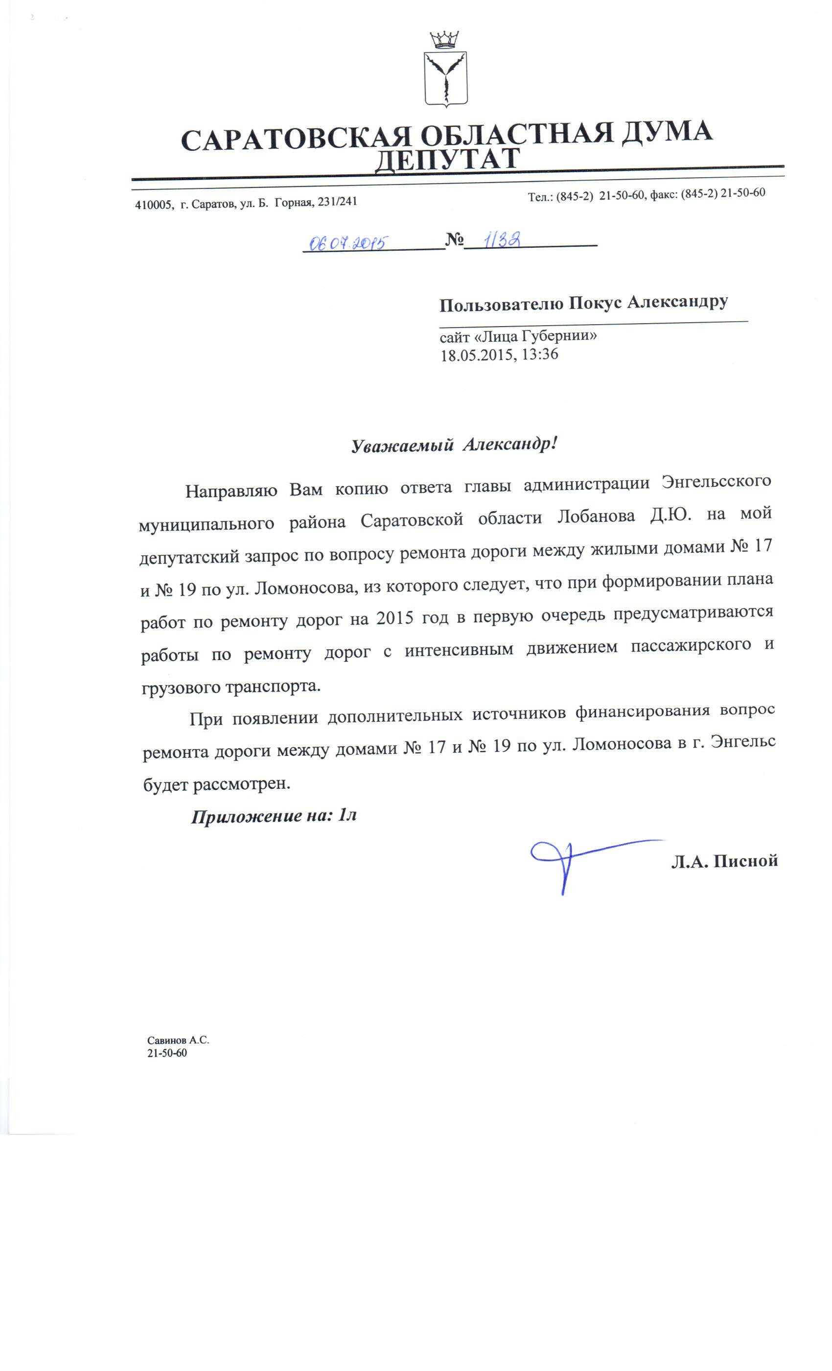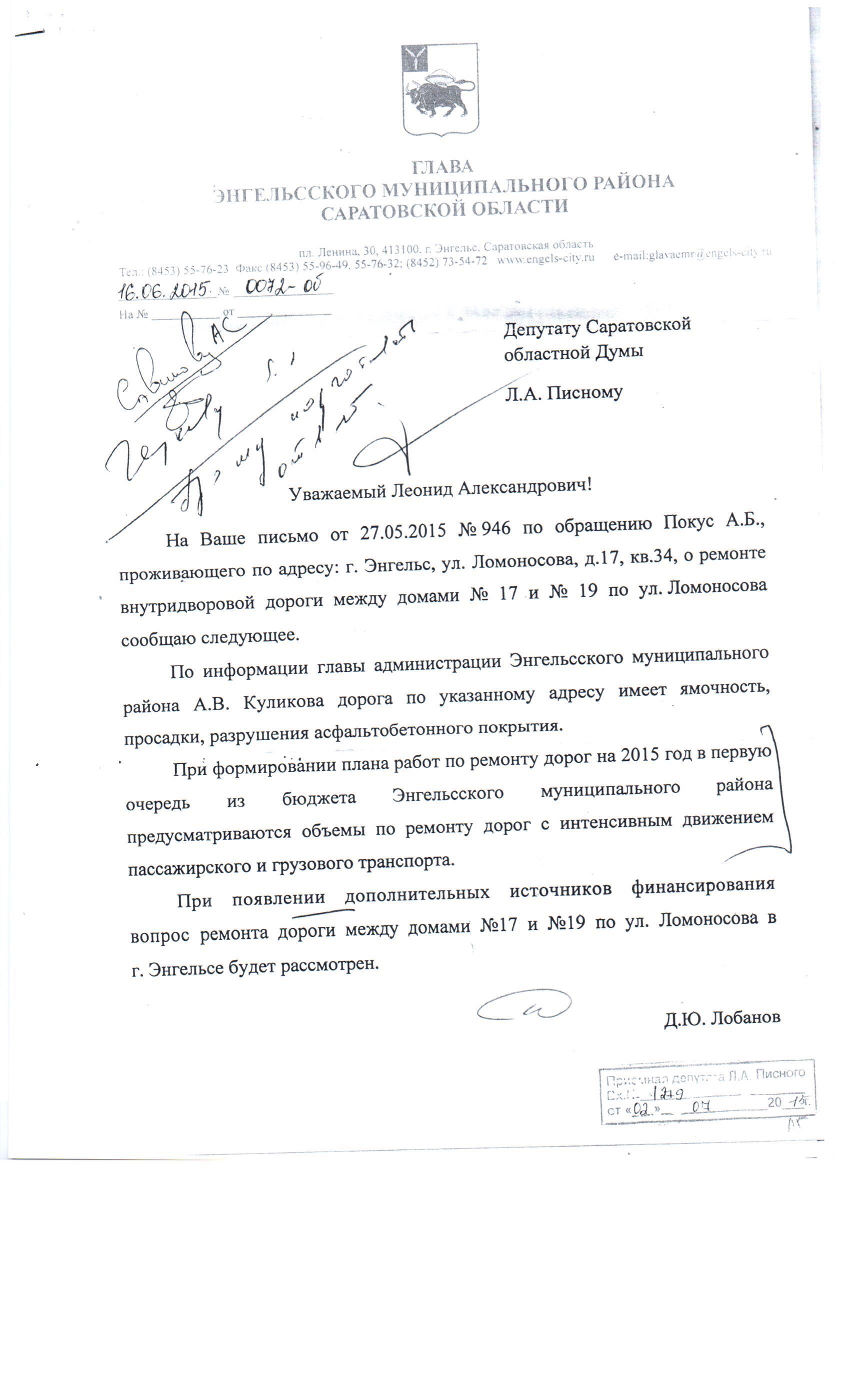 Здравствуйте, Леонид Александрович! Cпустя 3-года, вновь пишет вам инвалид 1 гр. дцп. Покус, Александр. А именно по поводу, разбитой дороги..да.. её опять разбили, и мне очень трудно проехать, не перевернувшись, минуя эти выбоины. Уже и 2 года прошло, как обещали ремонт дорог, всего двора сделать.. но так и не сделали. Вся Надежда опять на вас! Прошу, помогите! залатать выбоины.. по другую сторону от выбоины, обычно машина *газель* стоит.. мой адрес: г. Энгельс. ул. Ломоносова 17. Выбоины между домов 17 и 19 на выезде со двора