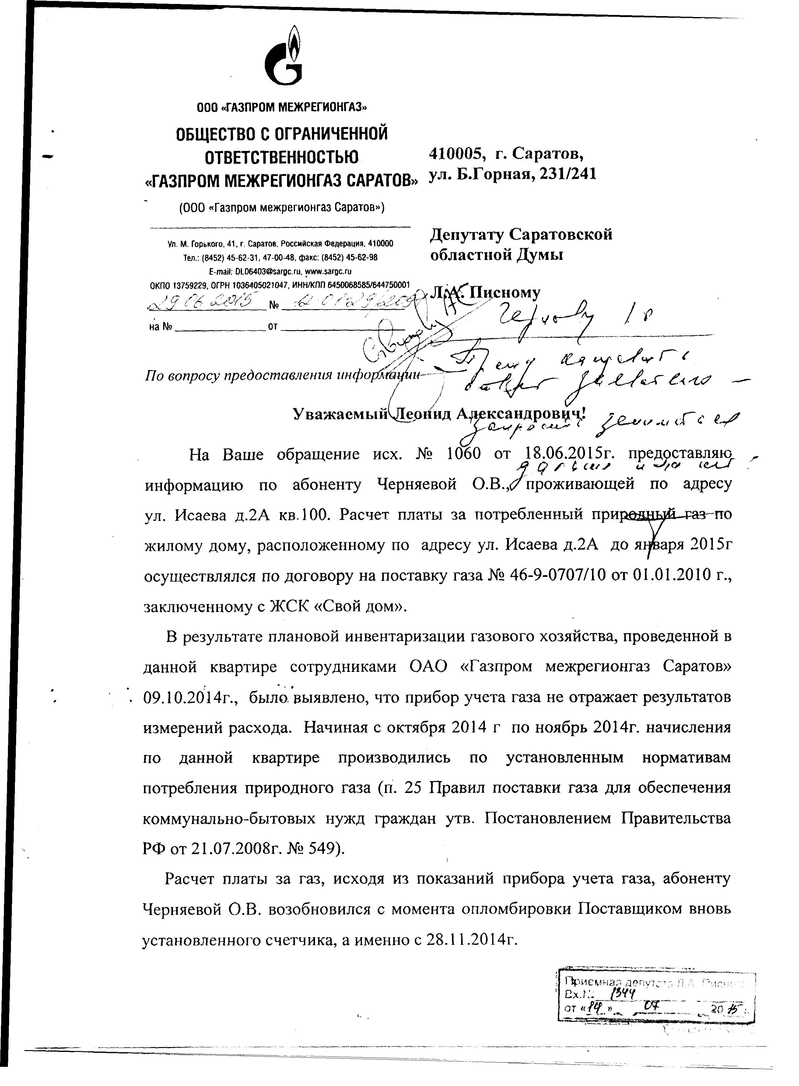 Здравствуйте, Леонид Александрович. 6 октября прошлого года я приобрела квартиру по адресу улица Исаева 2а. Возникли некие разногласия по вопросам оплаты коммунальных услуг с бухгалтером ЖСК, хотелось бы получить вашу оценку правомерности ее действий, советы и по возможности содействие в решение проблемы. 1. В октябре же мне была предоставлена квитанция с долгом в размере 1500 рублей за сентябрь. На мое возражение бухгалтеру о том, что долг за квартирой не может числится по закону РФ (так как материальные обязанности лежат не на квартире, а на собственнике) мне было отвечено, мол ничего не знаю и знать не хочу. 2. Так как квартира была приобретена с отделкой от строителей и без ремонта, мною были заменены приборы учета газа (а во время их замены как вы знаете газ начисляется по нормативу). Однако газовый котел оказался неисправен и поэтому отопление мною было запущено только в декабре. Мною были предоставлены в Саратовмежрегионгаз соответствующие акты (о неисправности отопительных приборов), они согласились списать мой дог в размере 8000 (за предыдущие 3 месяца по нормативу). С 1 января я получила лицевой счет для оплаты потребления газа непосредственно в газовую компанию, долга перед газовой компании у меня нет. Ежемесячно я отношу бухгалтеру квитанции за газ, подтверждая, что долга перед газовой у меня нет, однако бухгалтер отказывается списывать долг в размере 8000 за НЕПОТРЕБЛЕННЫЙ мною газ. И каждый месяц от ЖСК я получаю квитанции с этим долгом, а также красуюсь на двери подъезда в списках должников. Могу ли я написать заявление в прокуратуру о вымогательстве и неправомерности действий бухгалтера, или все таки можно будет решить этот вопрос, не отнимая время ни у меня ни у сотрудников ЖСК. Мой контактный телефон 8-987-805-39-92