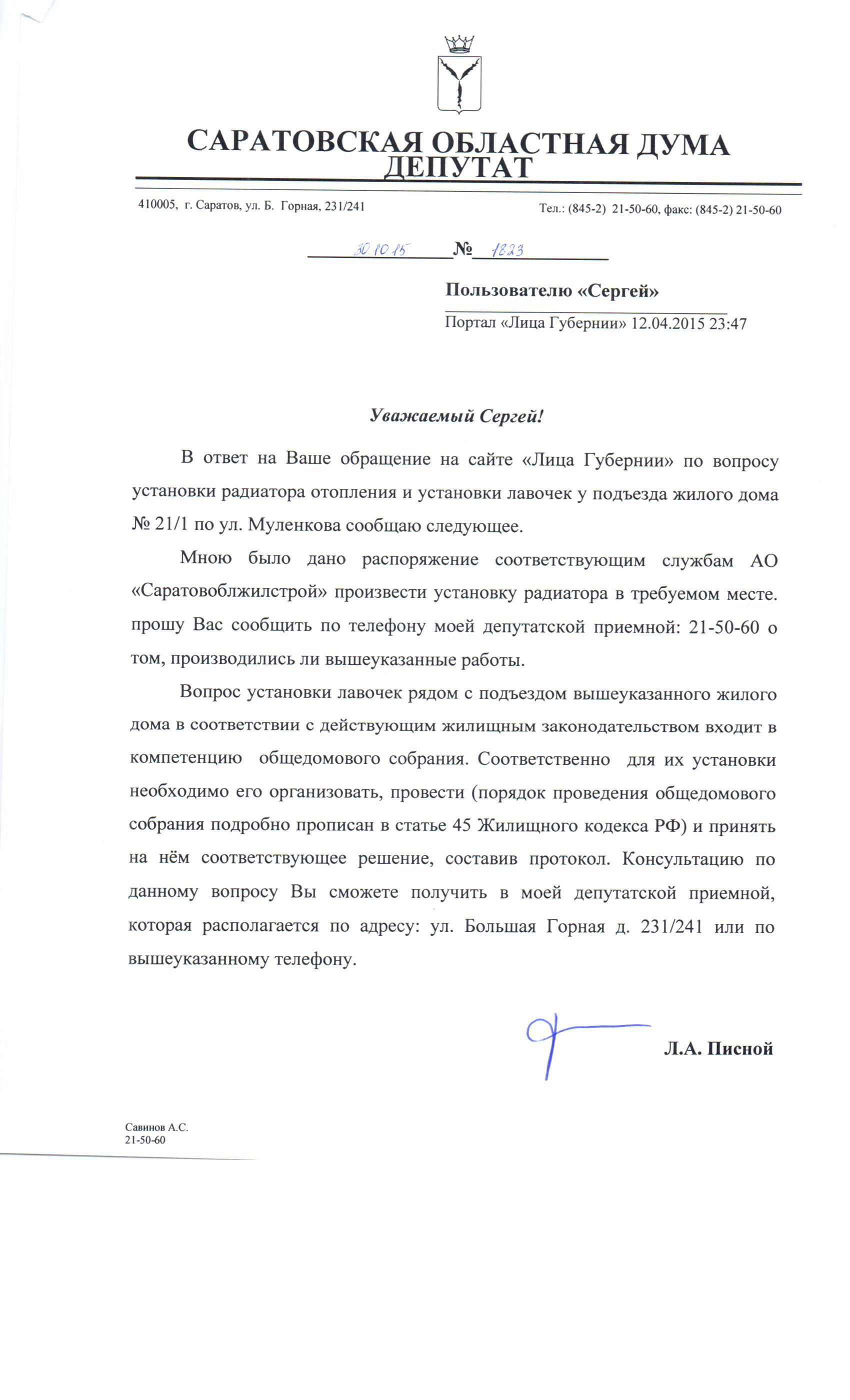 Уважаемая Татьяна, скажу Вам честно (я даже не хочу грузить Вас ответами, которые я получил, конечно, получил от всех. Поэтому те, кто спрашивают, кто такой Писной, они несколько лукавят), пока у меня сложилось впечатление, мы достаточно активно обсуждали эту тему с начальником ПТО «Саратовоблжилстроя» Еленой Алексеевной Настас, она очень грамотный в этом деле специалист, что в законодательстве имеет место противоречие. Эта тема меня заинтересовала, я не люблю, когда в законодательстве есть противоречие, поэтому я буду продолжать разбираться и по ходу пьесы Вас информировать. Если у вас интересные детали сообщите — мы любой помощи всегда рады. Я попрошу Елену Алексеевну, скажу Вам когда, и мы втроём посидим, посмотрим, как нам лучше выкрутиться из этого треугольника. Что касается вопросов, связанных с обустройством — их там масса. Эксплуатация в течении двух лет показала ряд недоработок, ряд нестыковок. Поэтому мы на сегодняшний день планируем систематизировать все вопросы. После этого я пройдусь с активистами домов. Там нет и выезда в ином направлении, кроме Исаева, ещё много чего. И уже потом будем что-то как-то пытаться улучшить. Поэтому ждите обратной связи, думаю, что это произойдёт после того, как закончатся мероприятия, связанные с 70-летием Великой Победы, и мы с Вами увидимся на месте.