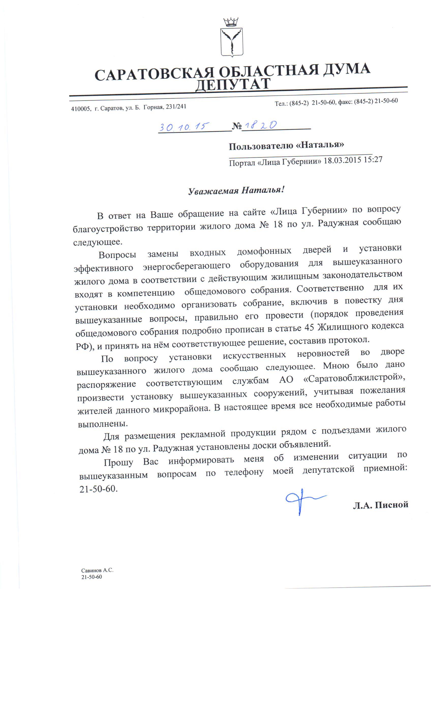Добрый день, Леонид Александрович!!! Хотела бы вновь поговорить о УК"Сфера", в сентябре 2014 г. мы (жильцы Русинвеста) присутствовали на Вашей встрече с УК и тогда ставили ряд вопросов по обслуживанию дома: эффективное энергосбережение, замена новых входных дверей и установка новых домофонов по адресу Радужная, 18 , которые не были установлены нам, установка лежачих полицейских, благоустройство территории. На данный момент ни один из вопросов не решен, лампочки не вкручиваются, не говорю уже о установке датчиков движения и энергосберегающих лампочках, замена дверей не произошла, домофоны не у всех установлены. Сфера никаких мер не принимает. Но на собрании Вам было дано обещание, что все будет устранено в кратчайший срок. Получается, что бесполезно о чем либо просить, даются лишь только обещания. Незаконную рекламу так никто ни разу и не убирал, как были обклеены все подъезды, так и остались. Я Вас очень прошу, повоздействуйте на УК "Сфера" в вопросе установки новых дверей по адресу Радужная, 18, на всех остальных домах двери поменяли, а на нашем доме двери все косые и поломанные. Постоянные сквозняки, дверь можно открыть приложив усилия и без ключа от домофона. Заранее Вас благодарю. P.S. Так же мы с Вами разговаривали по поводу отмостки у дома Радужная 18, она провалилась, Вы обещали все исправить. Скоро станет тепло и я очень надеюсь, что все будет устранено, так как вся вода стекает в подвалы.