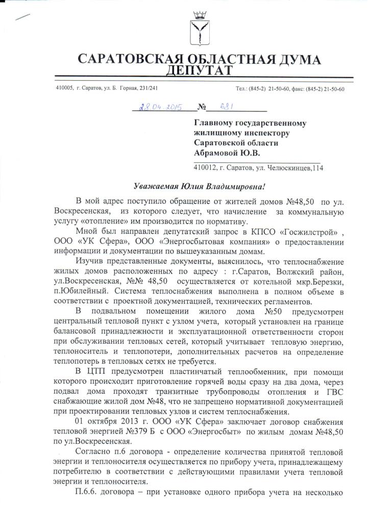 Уважаемый Леонид Александрович! Обращаемся к Вам, жители 6-го мк Кировского района г.Саратов. С момента начала отопительного сезона у нас возникла проблема недостаточно горячих батарей и недостаточно горячей воды в кране (чего не наблюдалось в предыдущие годы). Большую часть суток температура горячей воды в точке разбора (кран в квартире) держится около 40°С, что противоречит всем нормативным актам и правилам и САНПиНам. Управляющая компания "Благоустройство-С" отвечает, что это все по вине поставщика ТЭЦ-5. Что, якобы, это ТЭЦ не нагревает достаточно воду.И никаких точек давления на ТЭЦ, чтобы улучшить ситуацию, нет. Однако, за куб негорячей воды, в платежках нам ставят стоимость как за куб горячей. Плюс ко всему, вода до 50°С - это прекрасная среда для размножения разного рода бактерий и прочих микроорганизмов, которые опасны для здоровья людей. Приборы учета, по данным УК, фиксируют среднесуточную температуру горячей воды 50°С. Просим Вас оказать содействие в решении данной проблемы, так как УК ТЭЦ-5 должны соблюдать установленные нормы и правила и оказывать услуги надлежащего качества. Обращаемся к Вам за помощью, так как наша УК либо бессильна, либо заодно с поставщиком.