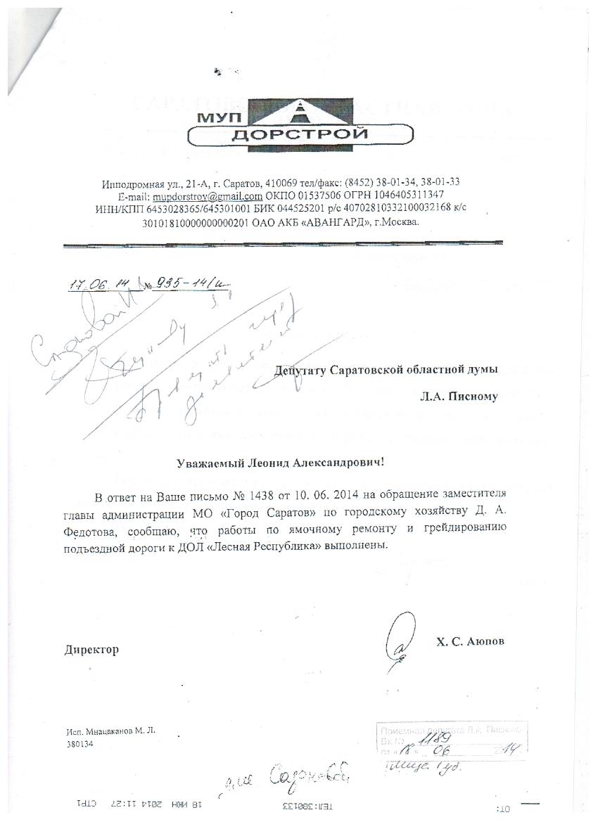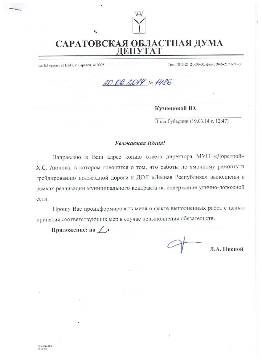 Доброе время суток! Уважаемый Леонид Александрович!Обращатся к Вам жители Ленинского района ул.Лесная Республика. У нас вопрос о ремонте дороги, которая ведет к нашему поселку, дорога эта сплошные огромные ямы. Невозможно проехать ни легковых автомобилям,ни газелям, которые возят пассажиров. Мало того, у нас очень много детишек в населенном пункте и с колясками проехать просто невозможно , бардюры отсутствуют напрочь!!! Так называемая "Дорога " очень узкая , но на ней паркуются автомобили сотрудников- "Пограничного управления ФСБ Росси". Людям вообще негде пройти!Просим Вас оказать нам помощь , что бы исправить сложившуюся ситуацию.(беда с отсутствием дорог существует более 2 х лет)Заранее благодарны!