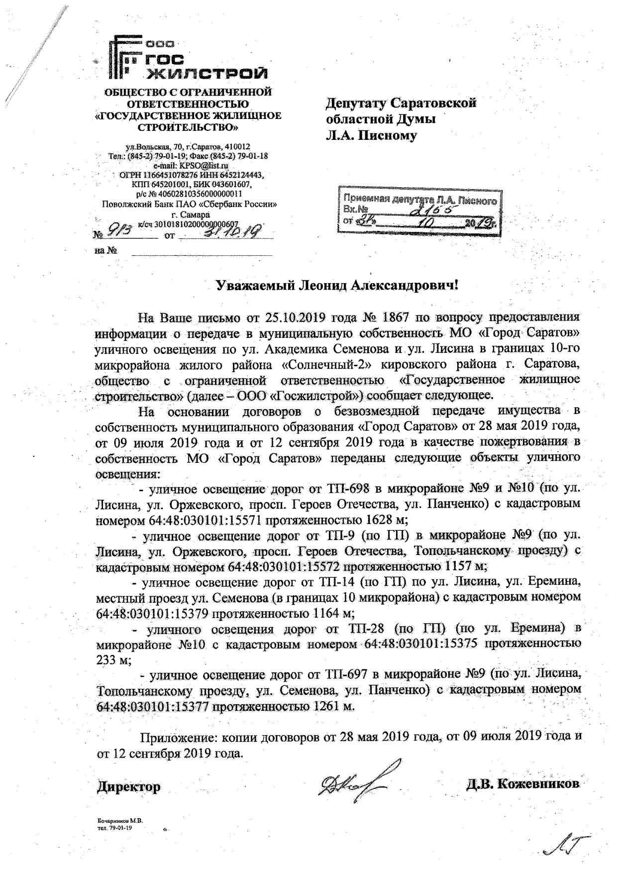 Уважаемая Вероника, очень много сделано по передаче электросетевого хозяйства, связанного с освещением, на баланс городским службам. Или ваш адрес выпал, или еще какие-то проблемы. Дайте, пожалуйста, время позаниматься.