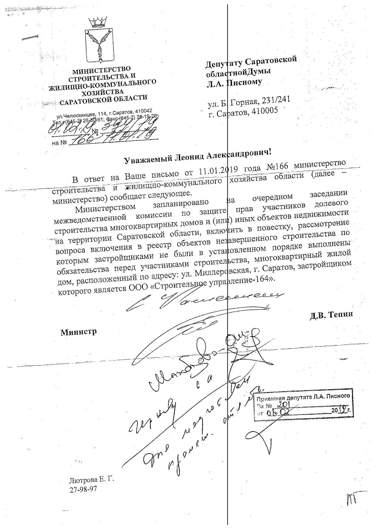 Уважаемая Ольга, я направил информацию о том, что дом необходимо включать в список проблемных, в межведомственную комиссию. Думаю, что на ближайшем совещании ситуация по СУ-164 будет рассмотрена. Сам он был у меня не далее как весной 18 года, я посмотрел его экономику, конечно, радоваться там нечему. Как обычно, демпинг при продажах привёл к остановке строительства. Пока каких-то мошеннических действий по тем материалам, которые я изучал, не заметил. Хотя, конечно, не являюсь сотрудником правоохранительных органов. Поэтому следите за информацией, но я думаю, что ситуация по этому объекту в ближайшие 2-3 месяца будет тщательно изучена, рассмотрена на соответствующей межведомственной комиссии. И намечены определённые мероприятия. Но не хочу вас обольщать, по опыту предыдущих лет, достройка проблемных домов занимает к сожалению от 2 до 4 лет.