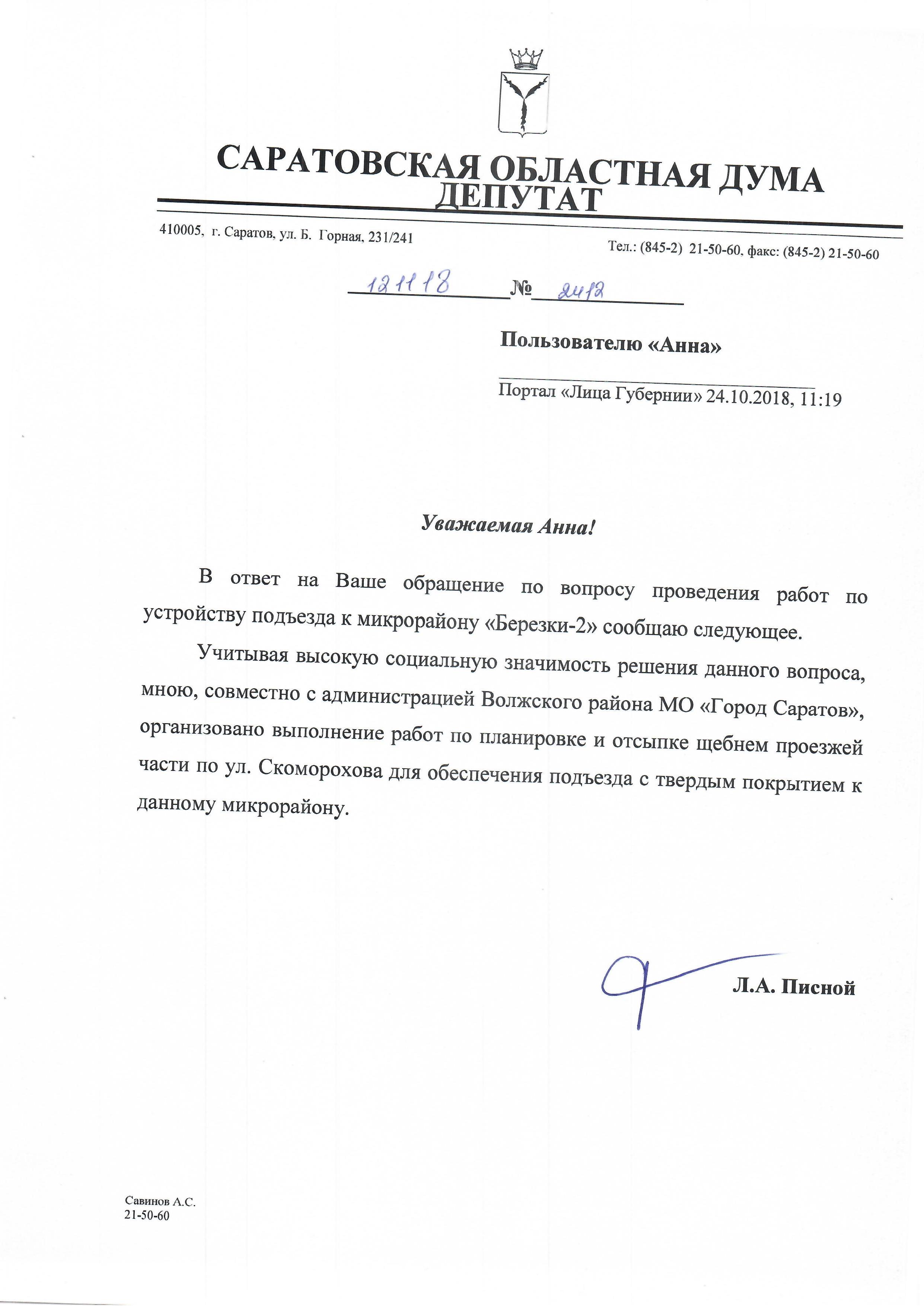 Уважаемый Леонид Александрович ! Спасибо за ваше послание и приглашение на встречу . Я сообщу в Вашу приемную свой контактный телефон для организации встречи. Считаю , что в беседе должны принять участие представители Администрации г. Саратова, выделившие земельный участок в непосредственной близости от городской свалки и полном отсутствии общественного транспорта под постройку многоквартирных домов для отселения граждан из аварийного жилья и сирот, поскольку , по документам , они купили там квартиры для данной категории граждан. Добавляю,что только "заразившись" Вашим оптимизмом по поводу ожидаемых результатов обновления администрации Заводского р-на согласны встречаться.