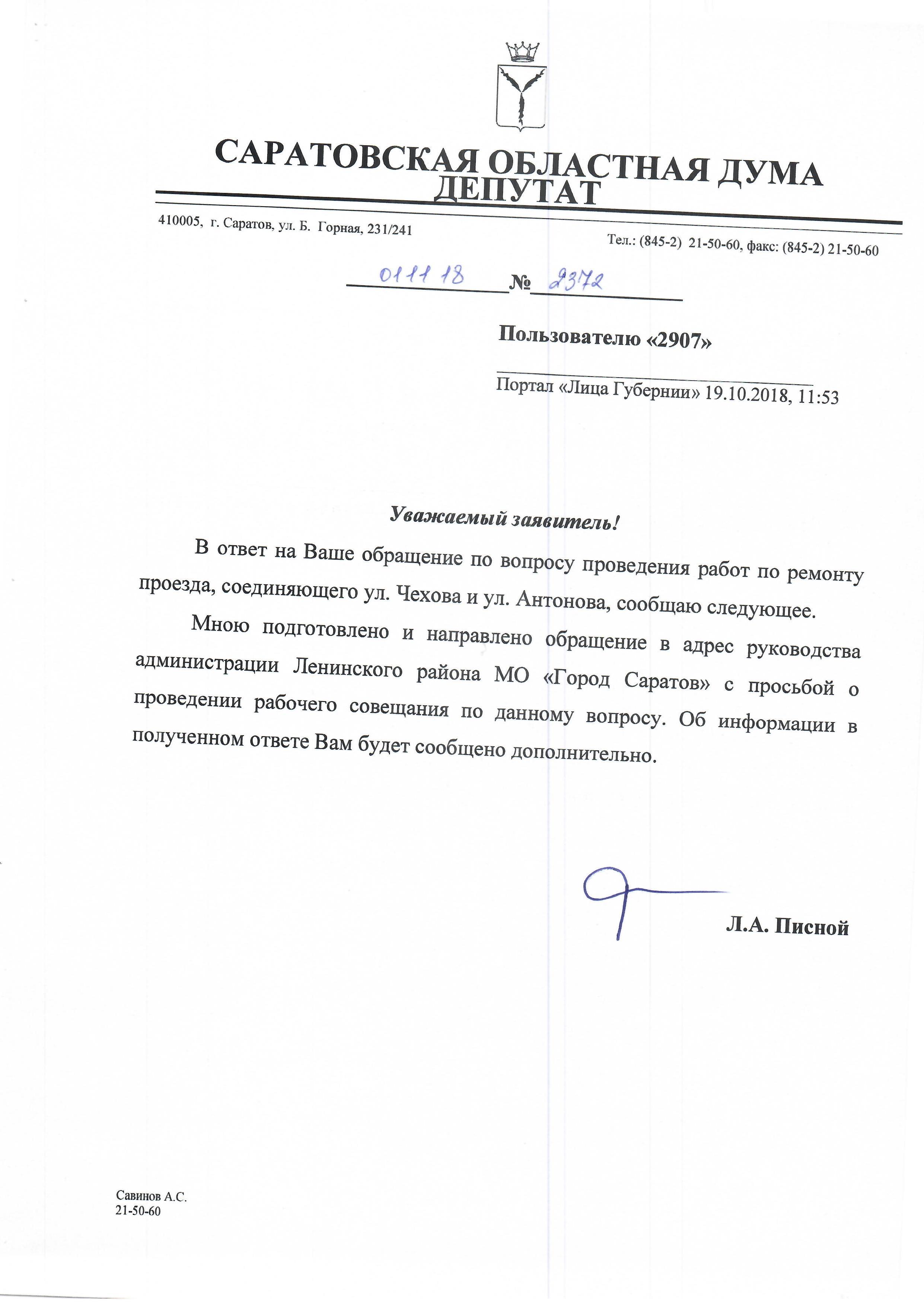 Уважаемый Леонид Александрович! Спасибо за ответ от 17.10 2018г. Вынуждены сообщить, что в целях экономии Вашего времени , считаем бессмысленной встречу с руководством Заводского района,т.,к. имеем ответы этих чиновников. Также у нас есть ответ замминистра.главы АДМ." МО г.Саратов" Р.В.Бусаргина и 4 чиновников, готовивших ему этот ответ,вызывающий и удивление и справедливое возмущение граждан. Сообщить можем только застройщика Лопатиной горы и арендатора земельного участка ( информация размещенная на самой стройке). Просим сообщить можно ли лично с Вами побеседовать в рамках приема граждан. Назначьте нам время и место встречи.