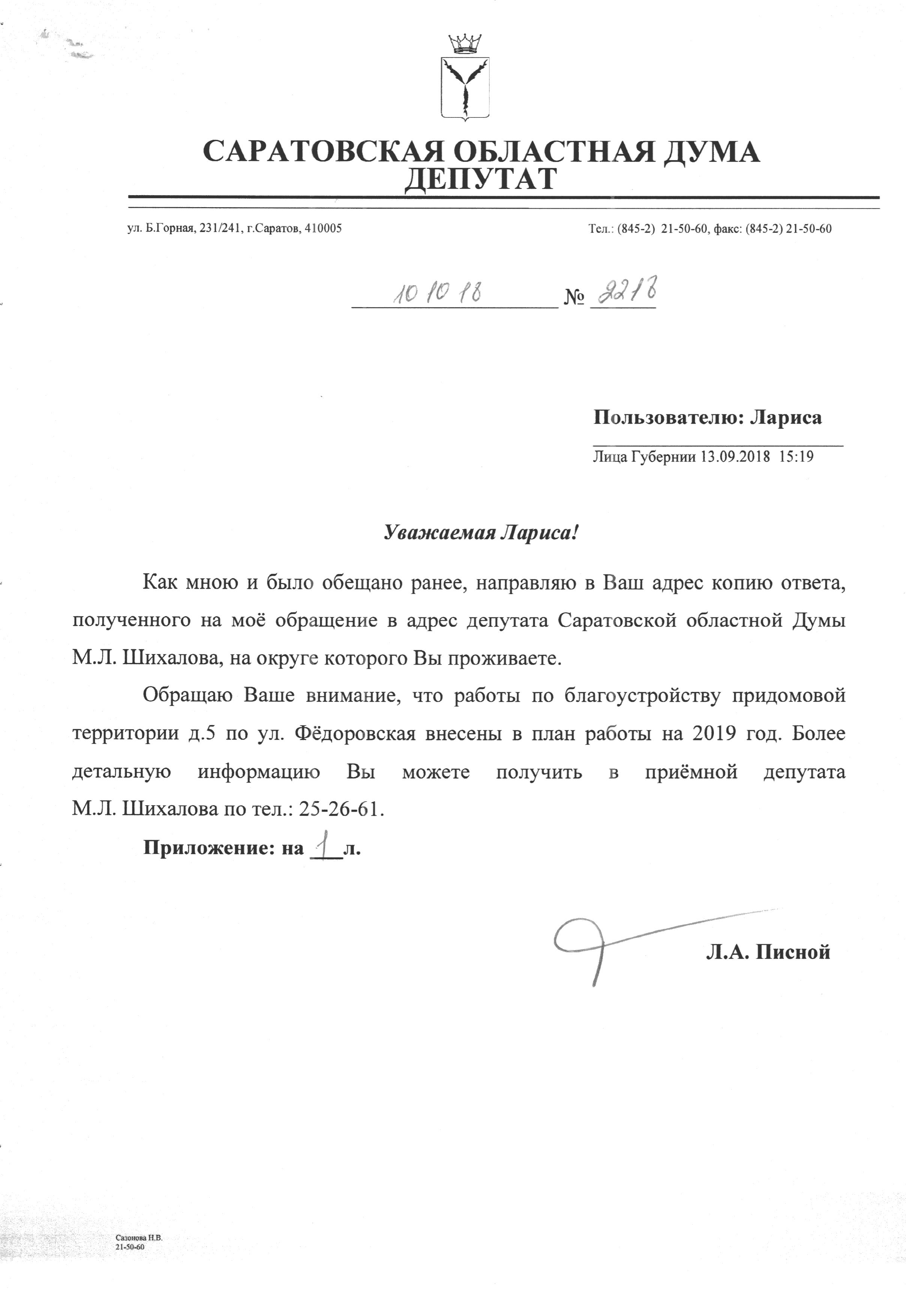 Уважаемая Лариса, я перешлю вашу просьбу своему коллеге Максиму Шихалову, и если ему нужна будет помощь, мы вместе объединим усилия и решим эту проблему. Но, единственное, думаю, не в этому году. На этот год у меня всё расписано в рамках своего избирательного округа.