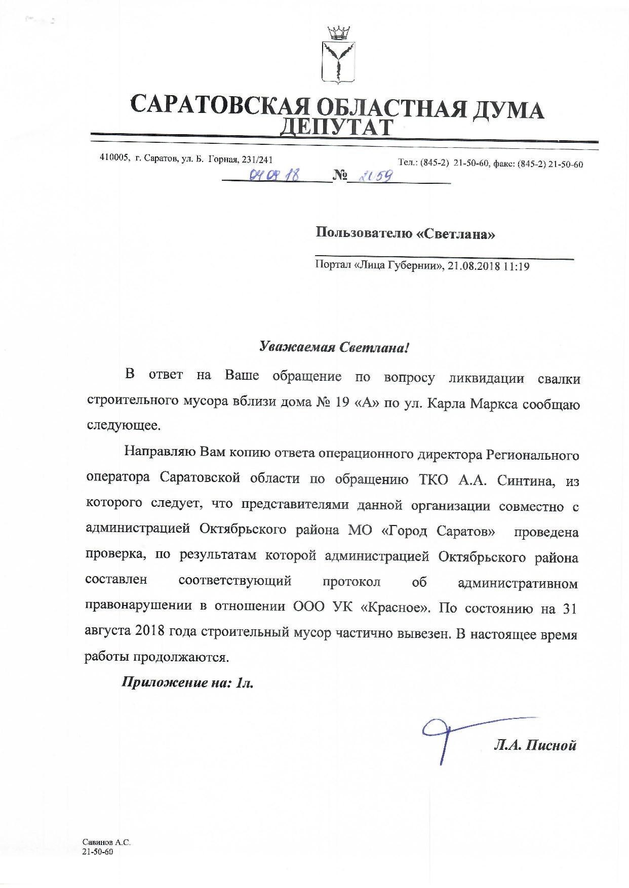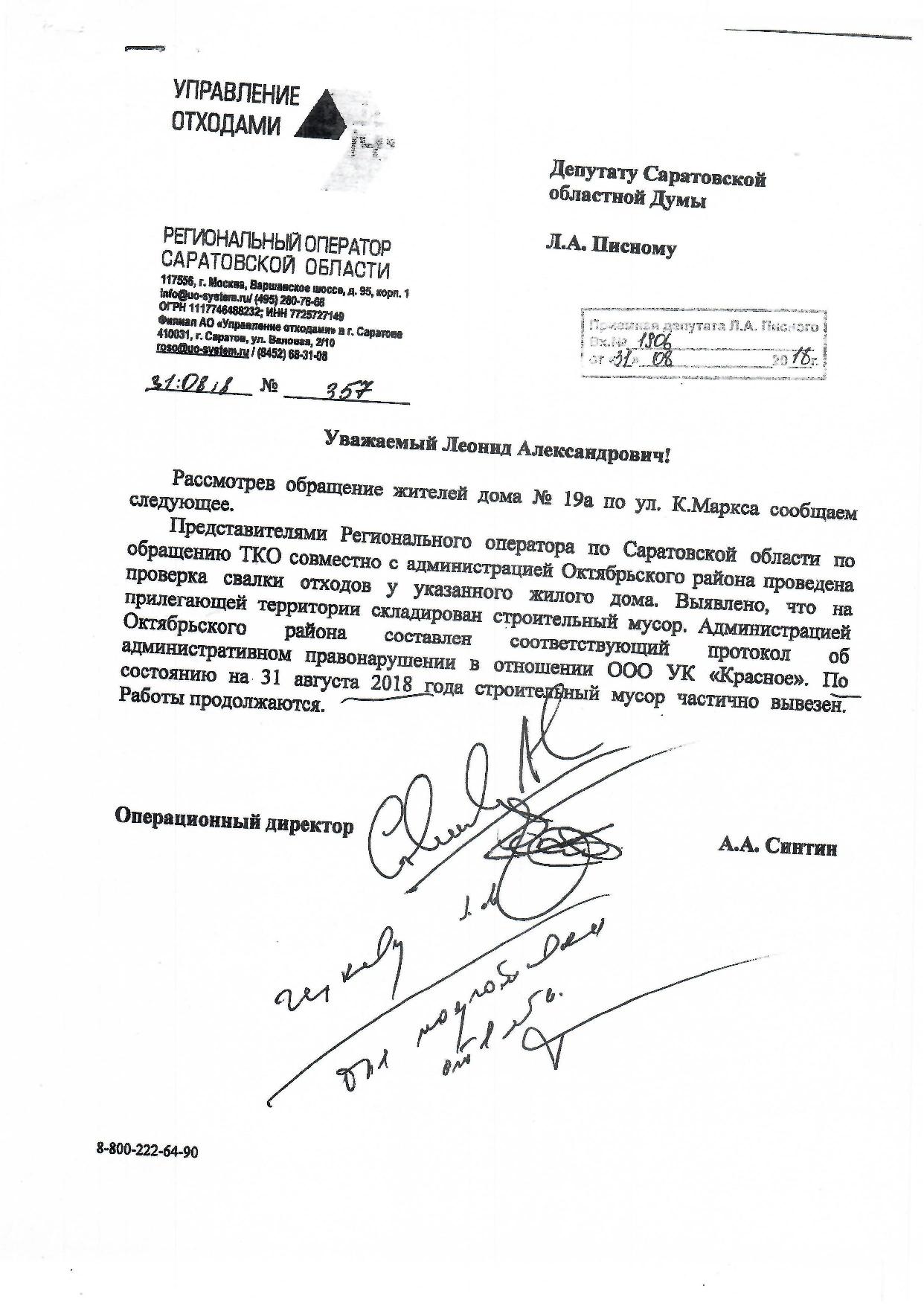 Уважаемый Леонид Александрович!Жильцы дома по адресу: г. Саратов, ул. Карла Маркса, 19А просят Вас разобраться с проблемой уборки свалки мусора во дворе дома по адресу г. Саратов, ул. Карла Маркса, 19А.