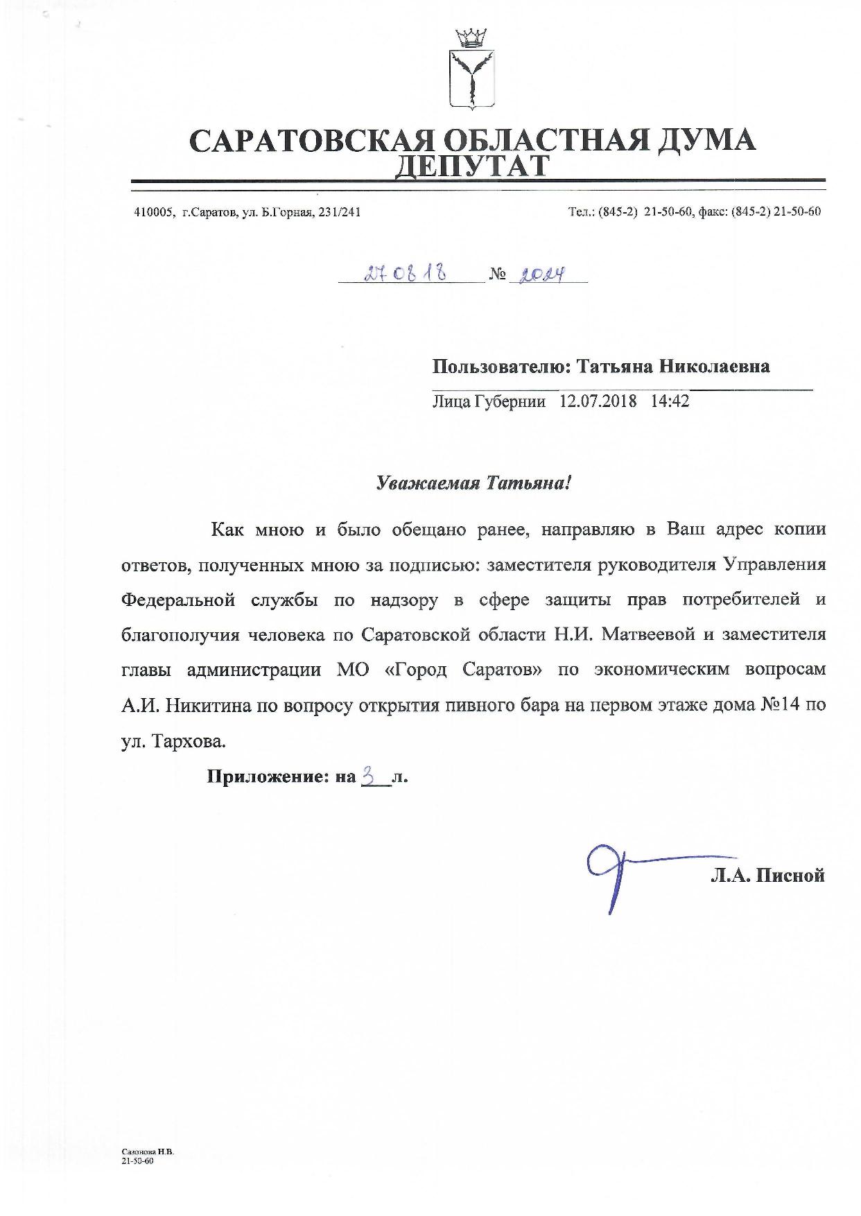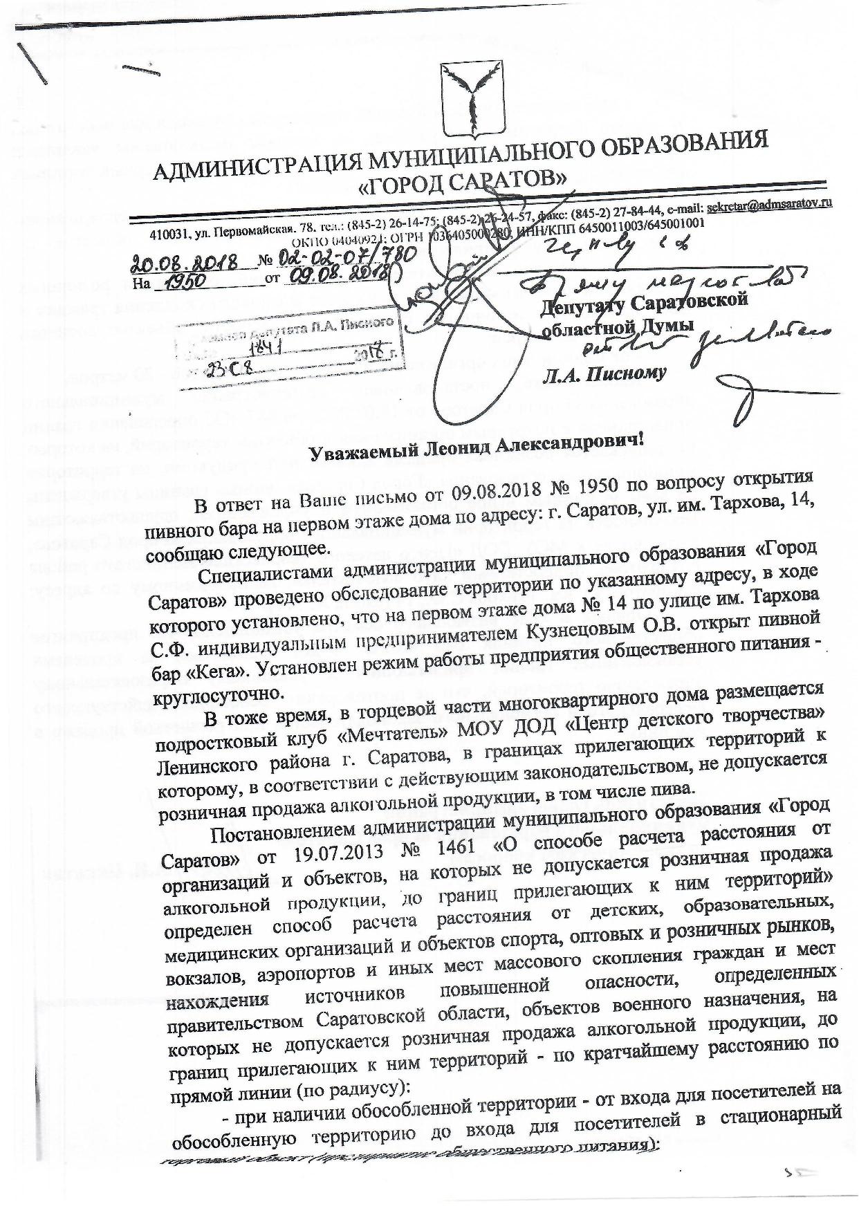 Просим Вас помочь нам предотвратить открытие пивного бара. В нашем доме по адресу Саратов ул Тархова д 14, открывают пивной бар. Как могли дать разрешение на это? На 1 этаже нашего дома находится детский клуб, и соседняя дверь пивной бар?, так же в шаговой достопности детский садик.