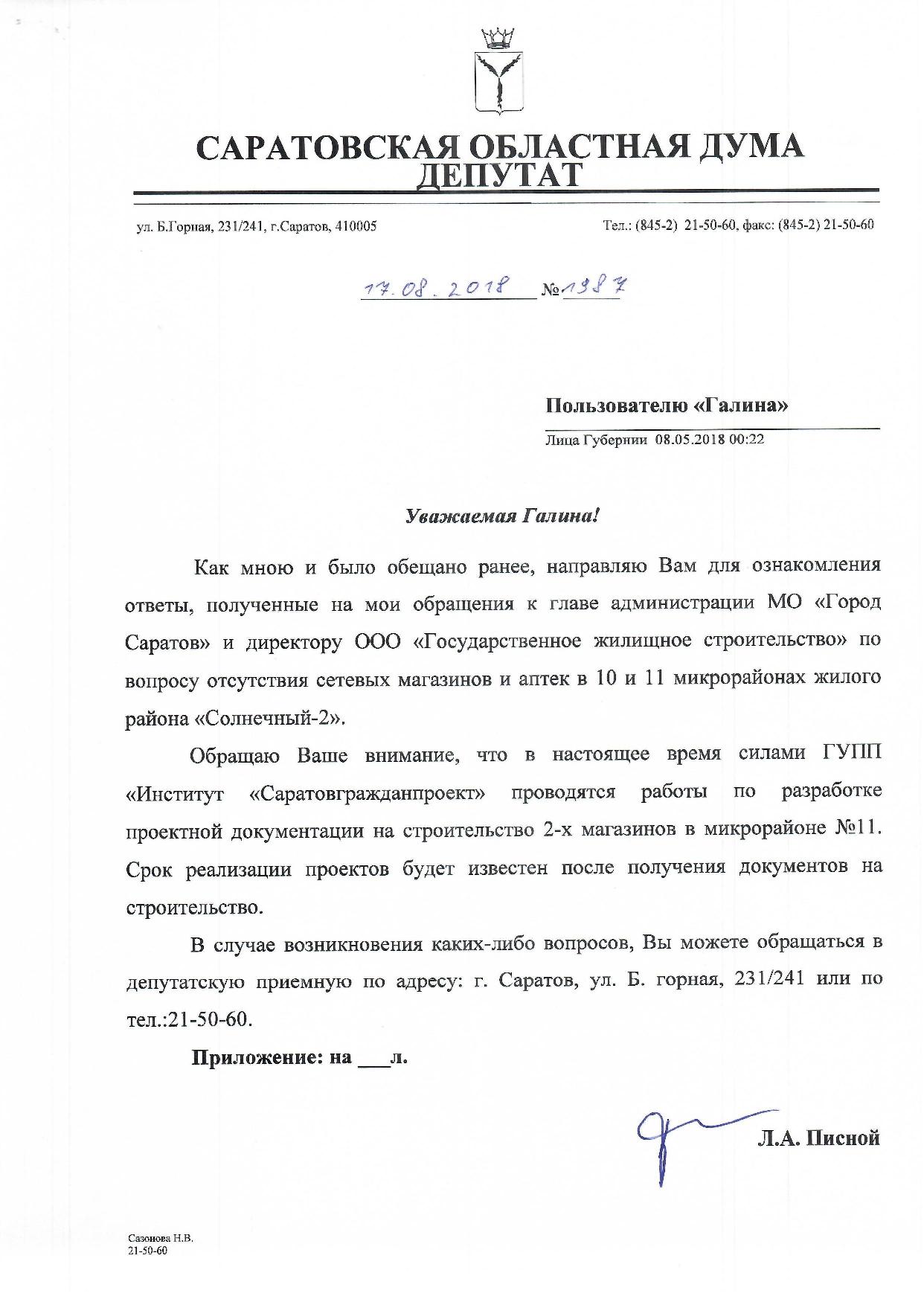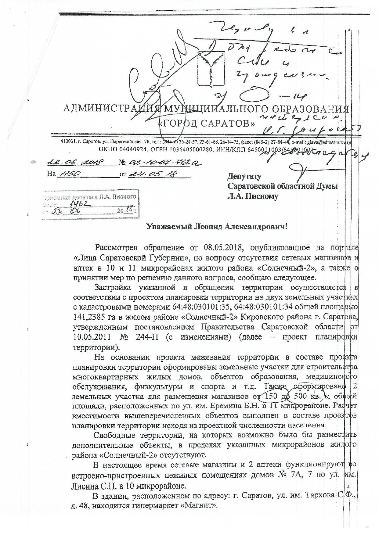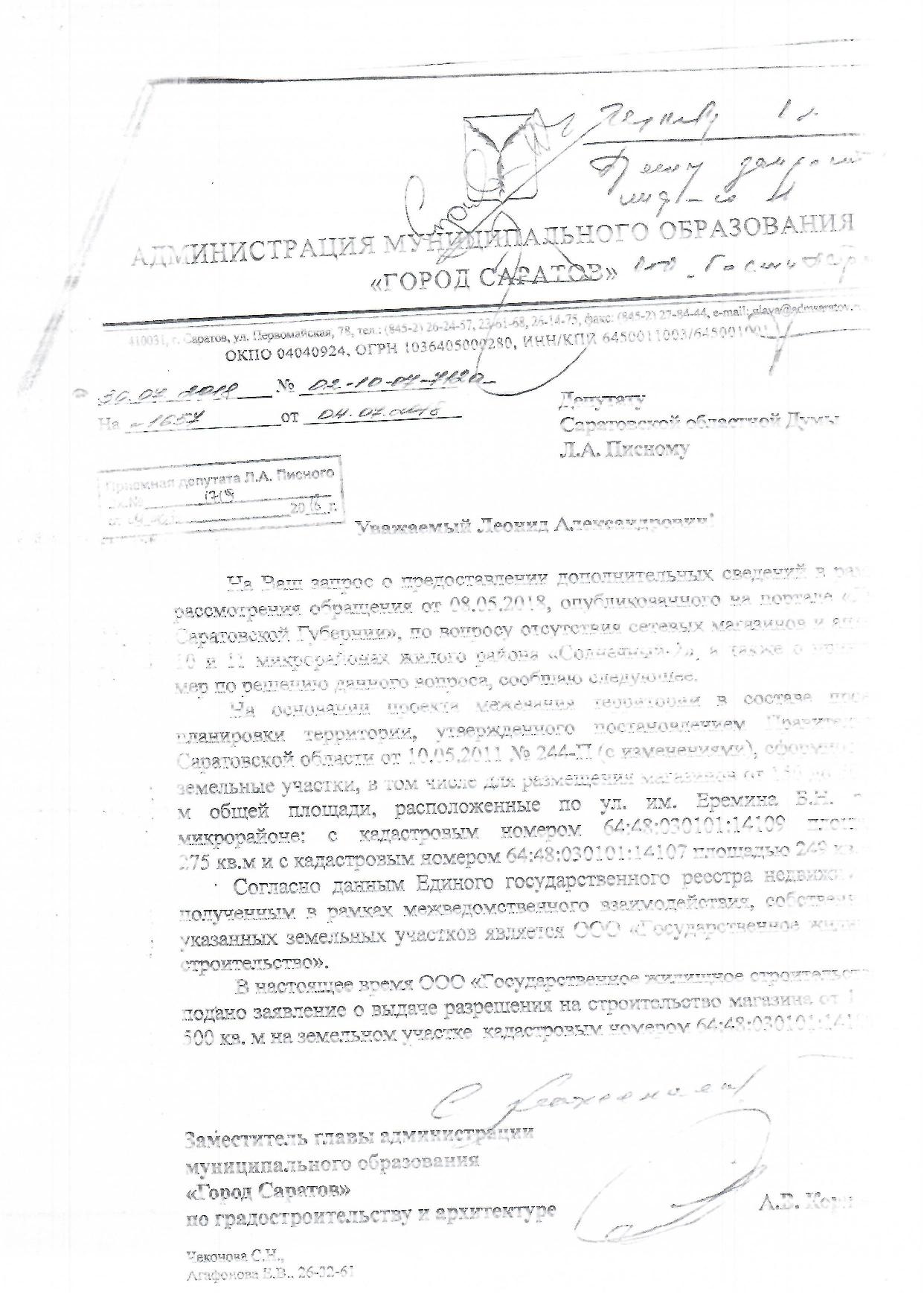 Уважаемая Галина, могу вам сказать, что это обычная ситуация для новых микрорайонов. Потому что вполне понятно, что торговля является бизнесом, а бизнес требует окупаемости. Но, думаю, что сейчас мы сможем несколько повлиять на этот вопрос. Я напишу соответствующее письмо в администрацию Саратова, проведём совещание вместе с сетевиками и застройщиками, и думаю, что места размещения этих магазинов мы найдём. Предполагаю, что к осени ситуация с размещением мест для реализации продуктовых товаров разрешится.