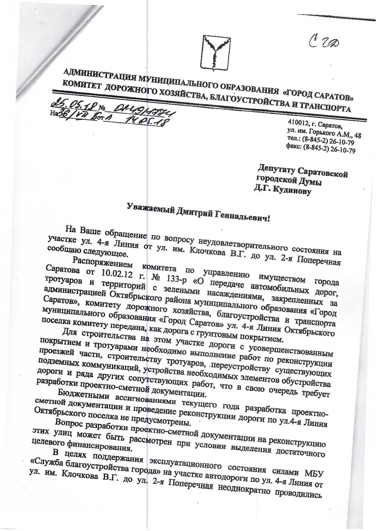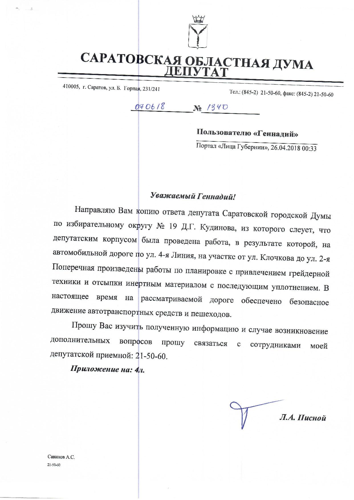 Уважаемый Николай, я специально поднял все ответы и могу вам сказать, что мы никогда не обещали устройство капитальной дороги для подъезда к построенному комплексу. Да и не могли это сделать, потому что не совсем по закону, когда граждане, которые оплачивают квадратные метры, должны будут из своих карманов оплачивать и то, что должны оплачивать органы местного самоуправления то есть строительство автомагистрали. Поэтому я говорил и много раз исполнял, что как депутат обращусь в администрацию Саратова, к своим коллегам с просьбой инициировать и реализовать строительство подъезда по одной из улиц от Клочкова до домов. Что касается «Саратовоблжилстроя», то и в 2016, и в 2015 году мы за счёт средств прибыли посыпали отдельные места щебнем. И готовы и сейчас (и я на встрече с кем-то из ваших соседей это подтвердил) помочь материалами, для того чтобы обеспечить всепогодный проезд. Но это не то, что бы хотели люди видеть — асфальтобетонное покрытие с тротуарами, как должны это быть. Мы просто физически такую работу исполнить не можем. Да и профинансировать её тоже. В моей практике как депутата в таких ситуациях встречались моменты, когда депутат территории должен работать с органами местного самоуправления, с правительством области и добиваться решения вопроса. Ярчайший пример: подъездная дорога к микрорайону Иволгино, обеспечение проезда (хотя пока ещё не капитального) к микрорайону Ласточкино. Для этого депутат должен пригласить на место администрацию, принять вместе с ними решение, как и чем, и дальше лоббировать решение этого вопроса. Могу сказать, что иногда депутату приходится и иным путём решать проблемы, которые в его округе. Также за счёт средств прибыли мы в своё время построили тротуар вдоль улицы Исаева, улицу Радужная привели в порядок, обеспечили твёрдый проезд по улице Исаева от микрорайона Берёзки до микрорайона Цветочный. Поскольку всё это было сделано за счёт спонсорских средств, всё это на сегодняшний день не принято администрацией Саратова и остаётся бесхозным. Поэтому первый вариант, совместно с органами местного самоуправления, он более предпочтителен. Я понимаю, что общая информация вам не интересна, поэтому я завершу тем, что обращусь в очередной раз в администрацию Октябрьского района. Сейчас в городе идут больше объемы работ, связанные с ремонтом улиц и дорог. По Саратову есть огромное количество практически бесплатной, так называемой асфальтной крошки, которую можно повторно использовать и обеспечить подходы и проезды. Но как дальше поведёт себя администрация Октябрьского района, поймите правильно, я ручаться не берусь. Поэтому ещё раз могу вам пообещать, что если инициативная группа вместе с моими сотрудникам определит, где необходимо произвести подсыпку щебнем, мы это сделаем.