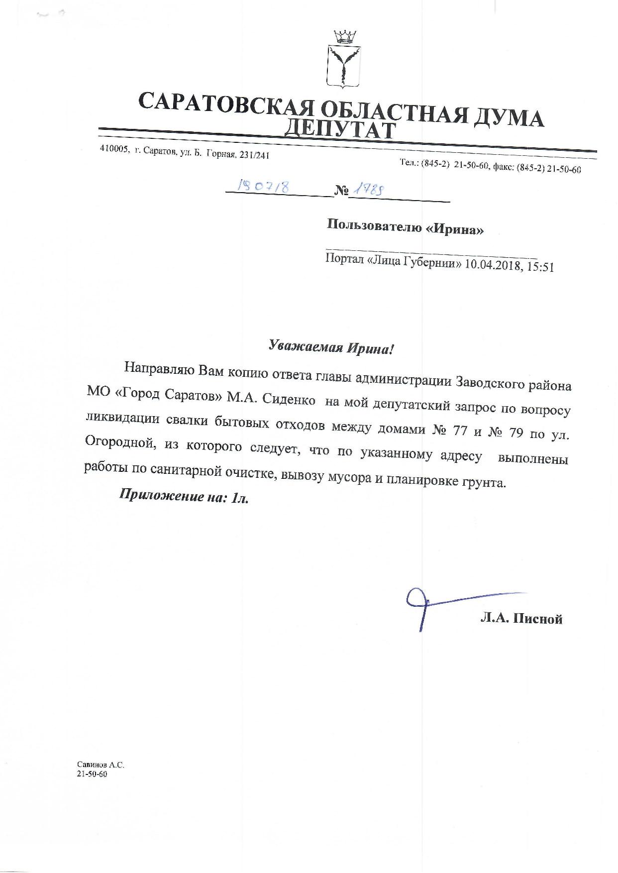 Уважаемая Марина, 21 апреля в моём кабинете состоялась встреча, по результатам которой выработана определённая позиция всех участников — были три управляющие компании, жители Ласточкино и первый замглавы администрации Ленинского района. Договорились, что во вторник, уже на территории администрации Ленинского района, пройдёт ещё одна встреча по принятию предложений одной из управляющих компаний, связанных с обеспечением сохранности 2-го проезда Блинова, безопасности граждан и ещё ряда вопросов. После этого ограждение должно быть снято. Во всяком случае, думаю, что нам удалось объяснить, что закон не на стороне тех, кто установил ограждение. Но, чтобы не было боевых действий, о которых вы пишете, надо, чтобы все стороны были удовлетворены. Поэтому, если вы пришлёте свой телефон, в среду 25 апреля мы сможем более конкретно вас проинформировать, что и когда будет сделано.