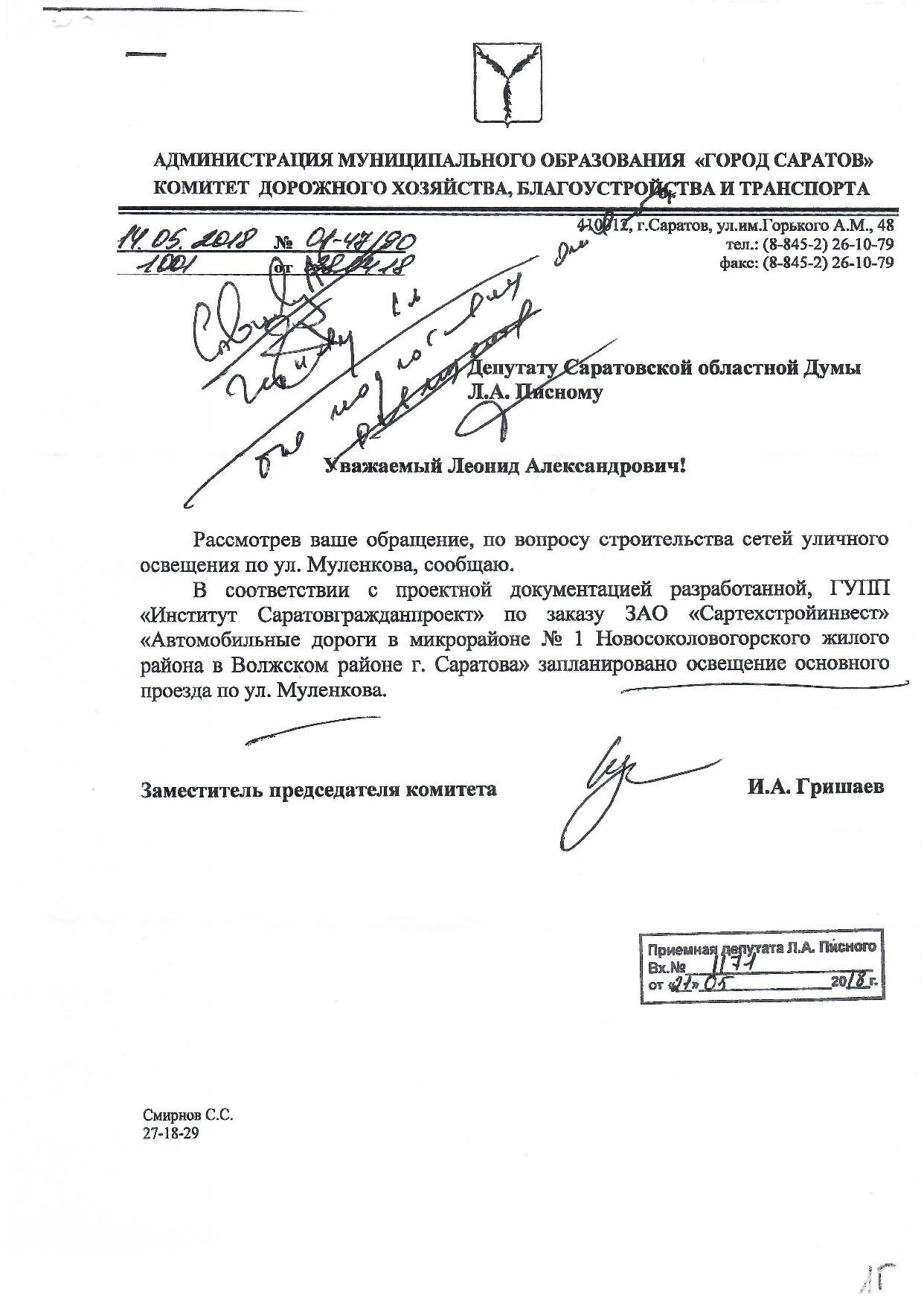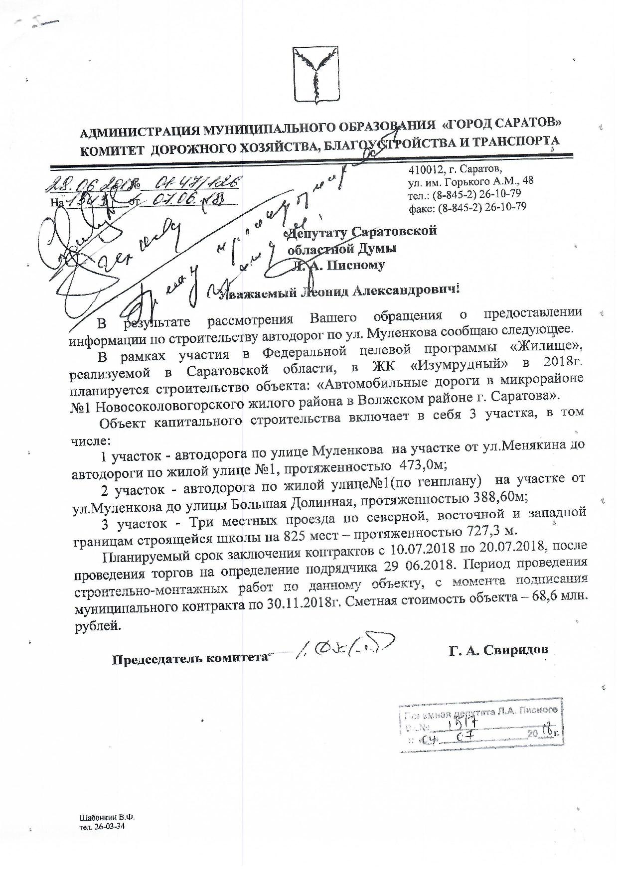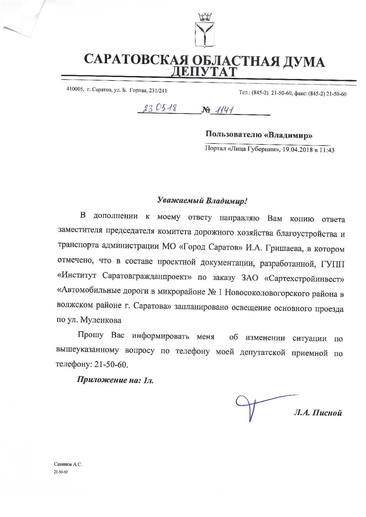 Уважаемый Владимир, могу вам сказать, что я не обещал построить дорогу к Муленкова, а обещал как депутат проявить максимум того, что мне позволяет закон, чтобы в хорошем плане пролоббировать этот вопрос. И думаю, что мне это удалось. В качестве подтверждения, я вам прикладываю выдержку из интервью заместителя председателя комитета по дорожному хозяйству Саратова Кузнецова. Это и есть ответ на ваш вопрос. Что касается освещения, то дайте мне возможность запросить комитет дорожного хозяйства, что входит в состав проекта на строительство дороги по улице Муленкова.