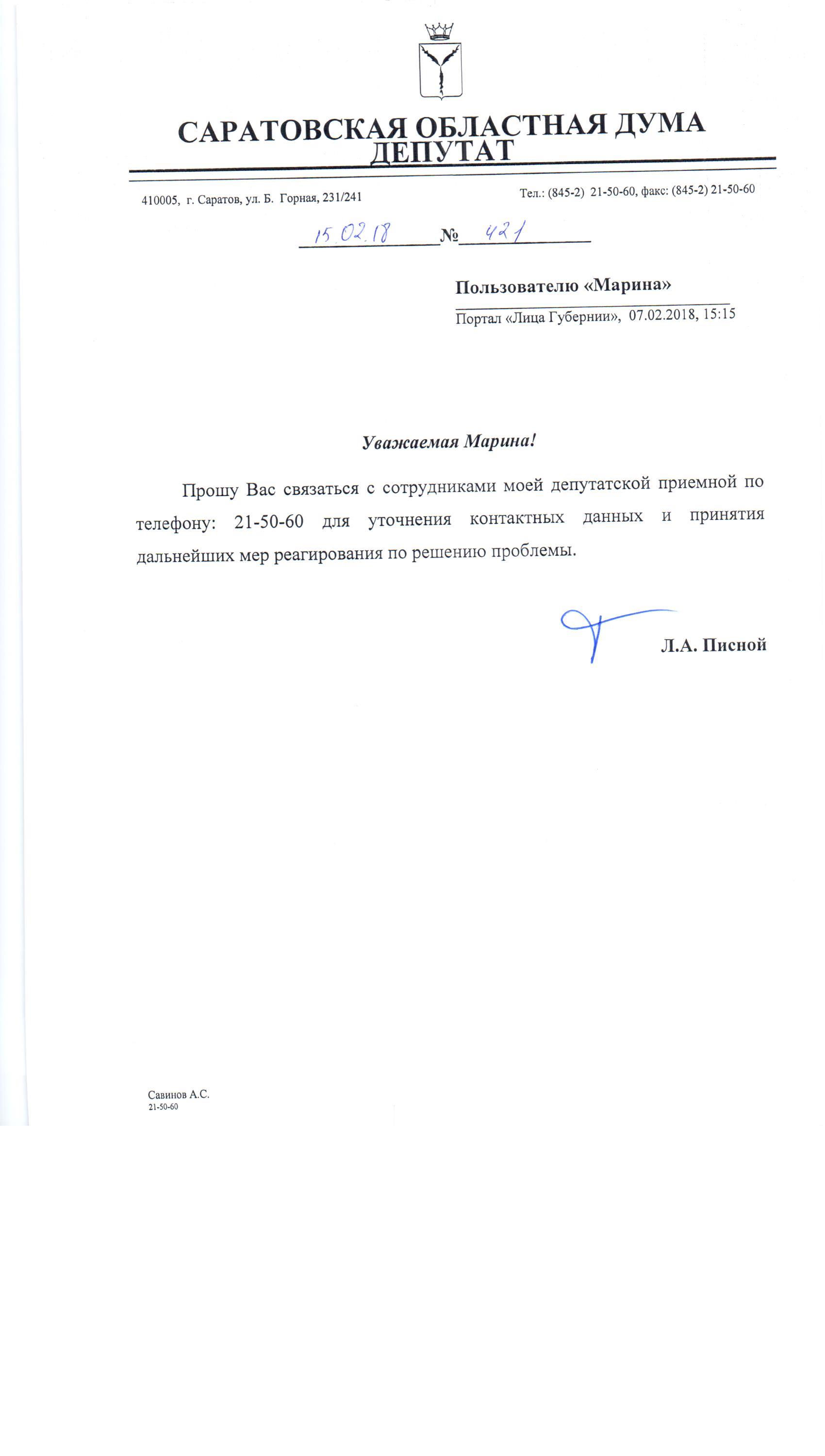 Здравствуйте Леонид Александрович. Обращаюсь к Вам очередной раз по вопросу присвоения почтового адреса дому на 1-ой Поперечной, 35 в г. Саратов. Вы уже здесь неоднократно обещали помочь разобраться в этой ситуации, но сдвигов до сих пор никаких. Адресом никто не занимается. Застройщик Алексеев \"Территория комфорта\", который обязан был всё это сделать, видимо сильно от всего устал и самоустранился. И ничего, видимо можно и так, и ничего за это не будет. Он якобы переложил эти обязанности на УК \"Саржилкомплекс\", которая тоже ничего делать не собирается. Управляющая даже ни разу не собрала общее собрание собственников. Видимо опасается этого, так как у людей набралось к ним слишком много вопросов и коллективное недовольство может оказаться для них губительным. Тем не менее, на начисление оплаты за коммунальные услуги отсутствие адреса никак не влияет. Тогда действительно, зачем им лишняя суета, когда и так всё прекрасно? Только вопрос, что делать нам жильцам и собственникам, самоорганизовываться? Тогда зачем нам вообще нужна управляющая? На звонки по телефону УК посылает по этому вопросу к застройщику, застройщик в свою очередь посылает в УК. Замкнутый круг. Раньше периодически хоть какие-то туманные обещания давали, теперь всё совсем затихло. Прошу Вас ещё раз обратить внимание на эту нерешаемую проблему. Спасибо.