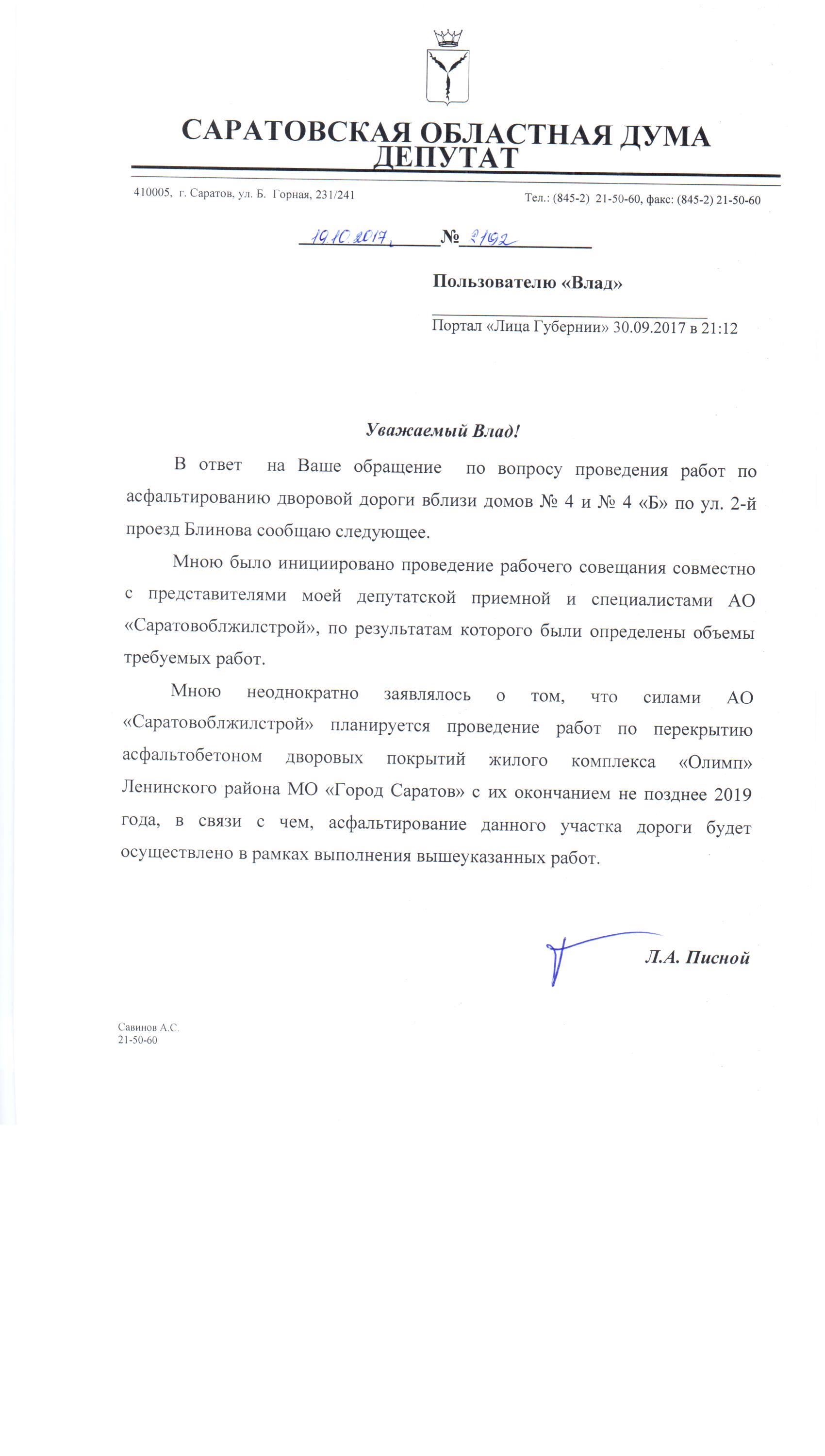 Уважаемый Геннадий, бывает всякое. Я бы не был столь категоричен, попосредничают сотрудники приёмной депутата — я им, естественно, доверяю больше, чем тем, кто связан непосредственно с производством, потому что у них глаз «не замылен». Добьюсь, чтобы вопросы были решены.