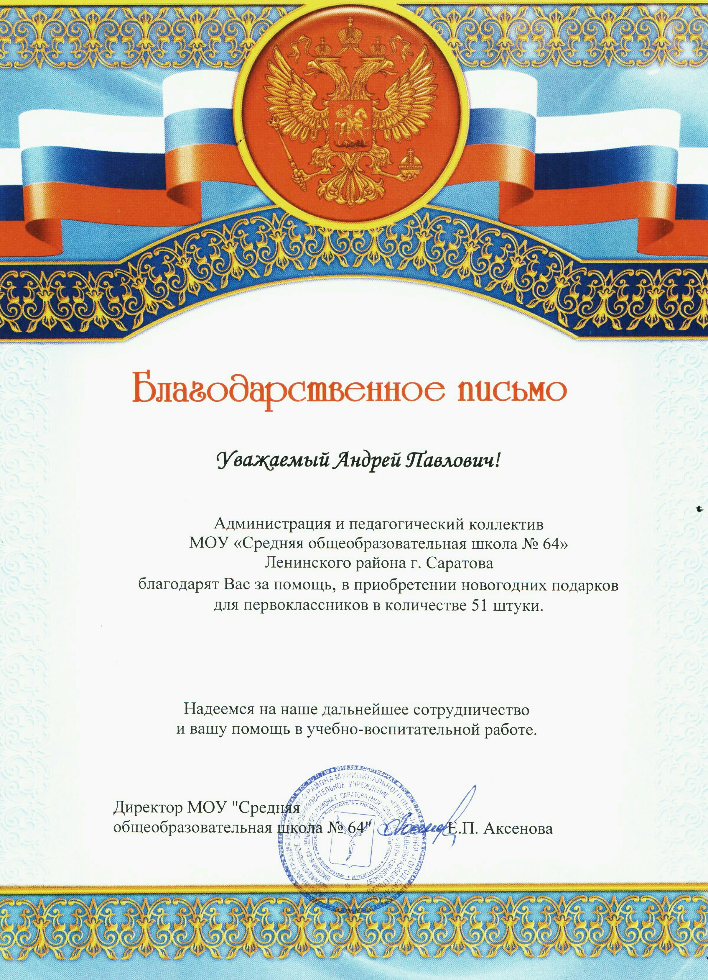 Уважаемый Андрей Павлович! Педагогический коллектив МОУ"СОШ 64" Ленинского района г. Саратова благодарит Вас за оказанную помощь в подготовке новогодних подарков учащимся первых классов.